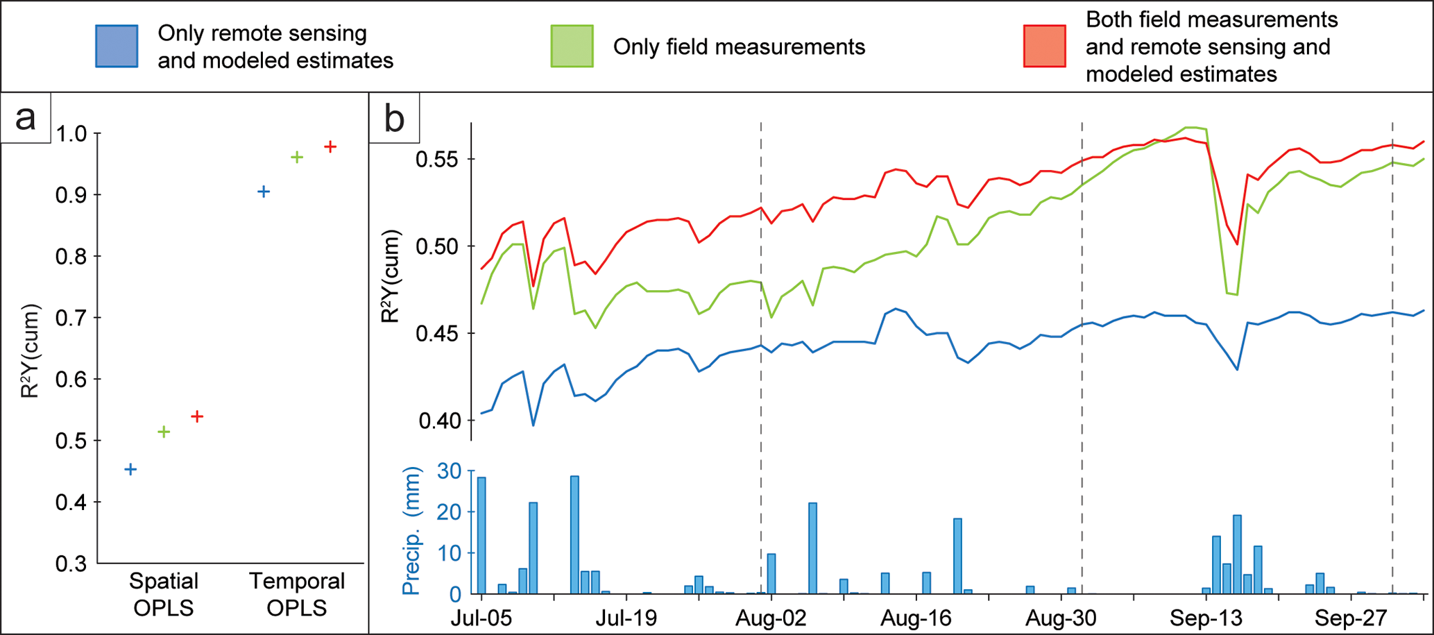 Figure 6OPLS model performance using only remote sensing and modeled predictors (blue), only field predictors (green), and all predictors combined (red). R2 Y(cum) indicates the cumulative proportion of variance in the response variable Y (i.e., soil moisture) explained by each model (see Table 3 for the models' specifications). Panel (a) shows the R2 Y(cum) values, indicated by crosses, of models using either the seasonal average per plot (spatial OPLS) or the spatially averaged daily time series across all sites (temporal OPLS) as the response variable. Panel (b) displays the R2 Y(cum) values of 92 daily spatial OPLS models over the study period (5 July–4 October 2022), with mean precipitation across Krycklan (from weather stations shown in Fig. 1) plotted below for reference.