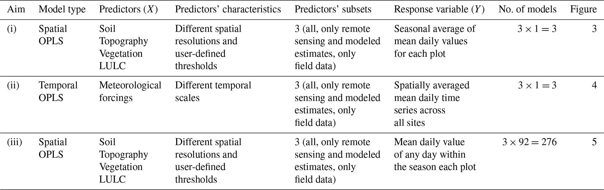 We created two types of OPLS models (Table 3). The first type, termed “spatial” OPLS, assessed the role of environmental predictors (soil, topography, vegetation, and LULC) (Table 1) in explaining the observed spatial distribution in soil moisture through direct plot-by-plot comparison. In these models, all environmental predictors varied across Krycklan but were assumed to be constant over time. Similarly, the response variable was spatially heterogeneous, but only one time step was included in each model. Specifically, to evaluate the relative importance of environmental predictors (aim i), we considered the soil moisture seasonal average, whereas to assess how the contribution of these predictors changed over time (aim iii), we ran the OPLS model 92 times using soil moisture daily values as the response variable (Table 3). The second type, termed “temporal” OPLS, evaluated the influence of meteorological predictors (Table 2) on the observed daily variations in soil moisture through direct day-by-day comparison (aim ii). In this model, all meteorological predictors and the response variable changed daily but were considered uniform across the study area (i.e., we calculated the spatial average) (Table 3).