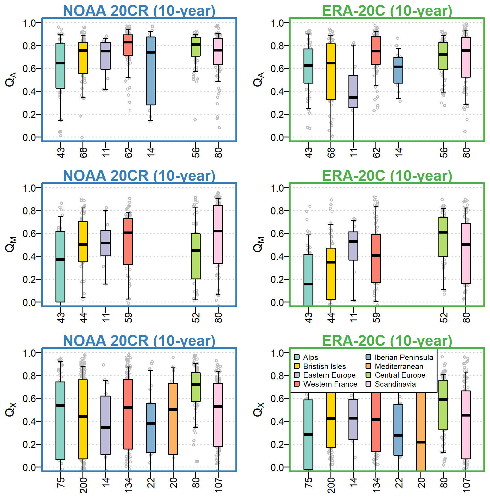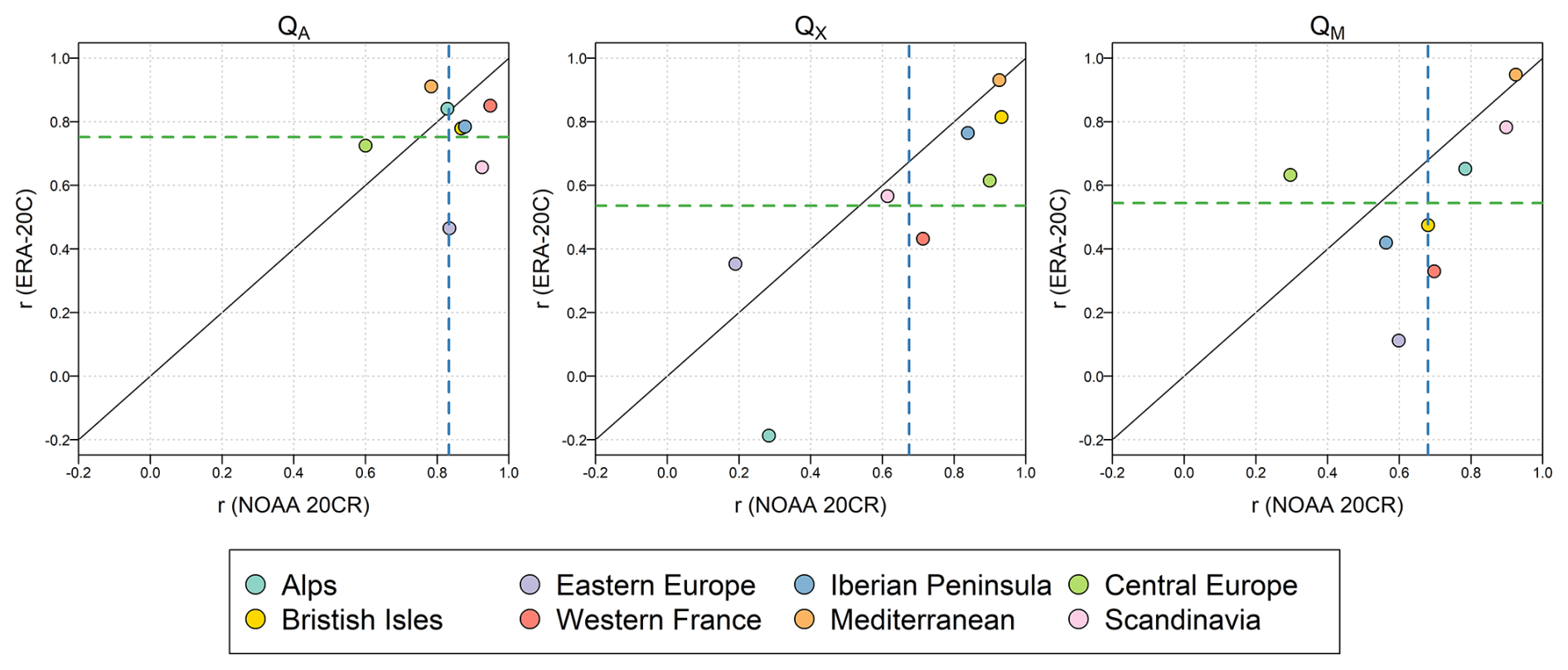 Figure C1Temporal correlation (r) over the 1903–1995 evaluation period between 10-year running means of the QA, QX, and QM observations and simulations for each region studied. Only years with at least 10 available catchments per region are considered. Dashed blue (resp. green) line represents the average correlation coefficient over all regions obtained using NOAA 20CR (resp. ERA-20C).