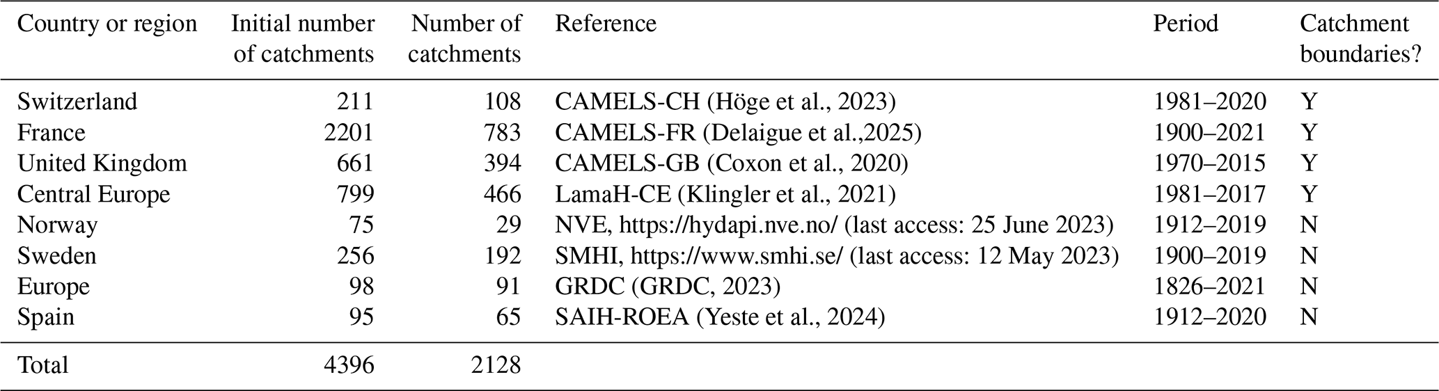 An initial sample of 4396 European catchments was assembled from a collection of several “CAMELS-like” datasets (cf. Table 1). This sample groups catchments with daily streamflow series from national datasets (CAMELS-CH (Höge et al., 2023) in Switzerland, CAMELS-FR (Delaigue et al., 2025) in France, CAMELS-GB (Coxon et al., 2020) in the United Kingdom, the NVE (The Norwegian Water Resources and Energy Directorate) dataset (using the NVE Hydrological API (HydAPI), https://hydapi.nve.no/, last access: 25 June 2023) in Norway, the SMHI dataset (https://www.smhi.se/, last access: 12 May 2023) in Sweden, and SAIH-RODEA (Yeste et al., 2024) in Spain), transnational datasets (LamaH-CE (Klingler et al., 2021) for Austria, Germany, the Czech Republic, Switzerland, Slovakia, Italy, Liechtenstein, Slovenia and Hungary), or global datasets (GRDC, 2023). Note that 77 duplicate stations were removed from the CAMELS-FR, CAMELS-CH, GRDC, and LamaH-CE datasets.