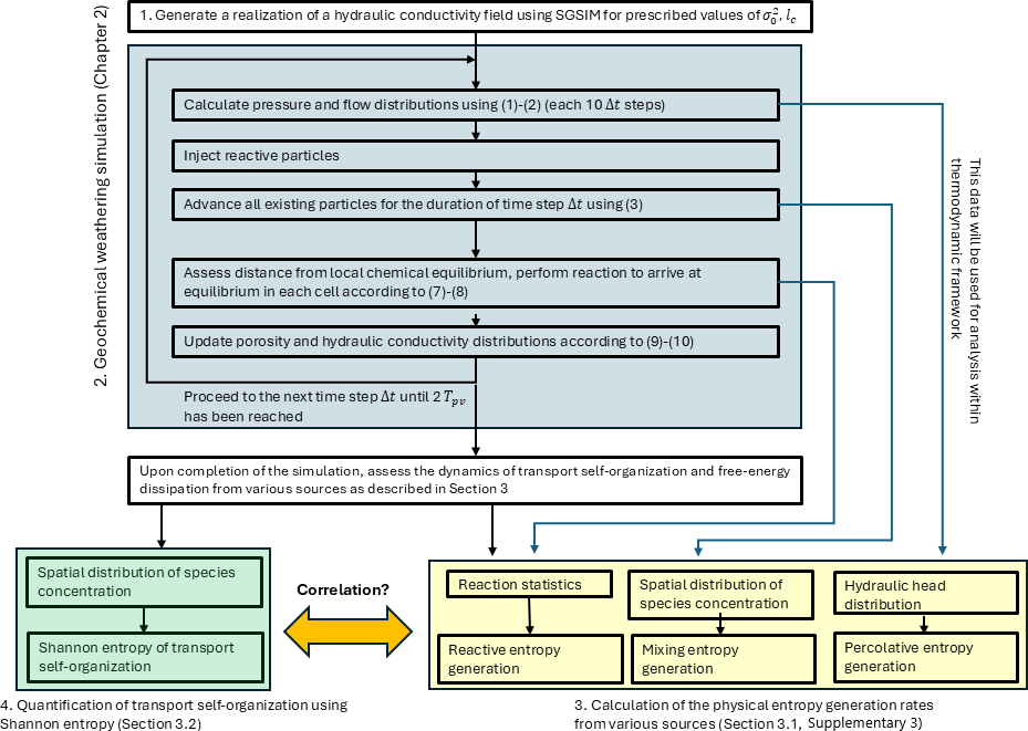 Upon completing the chemical weathering simulation as described in Sect. 2 (Block 2 in Fig. 1), we employ the obtained results to investigate the correlation between the emergence and intensification of preferential flowpaths and the evolution of dissipative dynamics due to reaction-transport interaction in our system. We analyze the latter using tools from non-equilibrium thermodynamics (Block 3 in Fig. 1), while quantification of the former requires basics of information theory (Block 4 in Fig. 1). This section presents the methodlogy for establishing this correlation, including basic concepts and results for both disciplines.