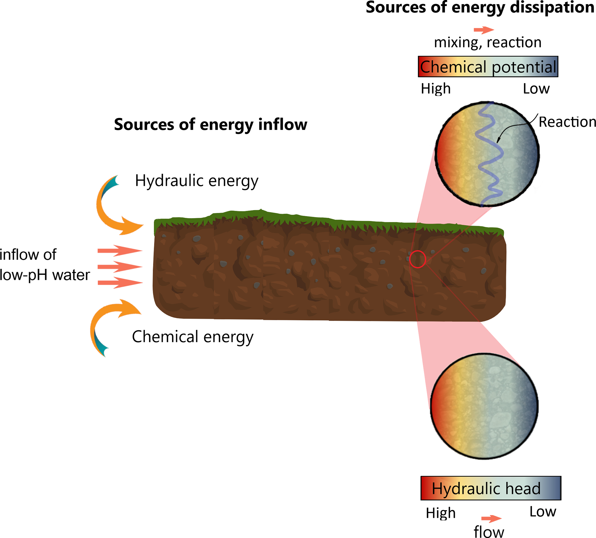 When applying the non-equilibrium thermodynamic framework to the problem of reactive flow in porous media on a Darcy scale, characteristic of chemical weathering, our system can be viewed as subject to free energy inflow in the form of (a) hydraulic head gradient that maintains flow through the medium and (b) inflow of reactive species which creates chemical potential gradient in the porous medium, leading to mixing and reaction. This energy is being spent via the dissipative dynamics, created by the following interrelated processes: (a) percolation, which in the context of our work corresponds to fluid transport through the porous matrix; this involves dissipation of hydraulic power while overcoming the hydraulic resistance of the matrix due to viscous friction effects, affecting concentration distribution of the chemical species and directly influencing chemical reaction, (b) mixing of chemical constituents that involves dissipation of chemical energy and affects the reaction rate and (c) chemical reaction of dissolution-precipitation, also involving dissipation of chemical energy, which affects directly the transport through matrix by altering the transport properties of the matrix. This is depicted graphically in Fig. 2 that presents the schematics of energy inflow and dissipation mechanisms in chemical weathering. We neglect temperature variations and ensuing heat transfer effects in the porous matrix. Thus, in our model problem the conjugate pairs of thermodynamic potential gradients that drive the corresponding fluxes are: (a) hydraulic head gradient that drives the mass flux, (b) chemical potential gradient that drives the molar fluxes of the chemical species and (c) gradient of the partial molar Gibbs energy that drives the extent of reaction.