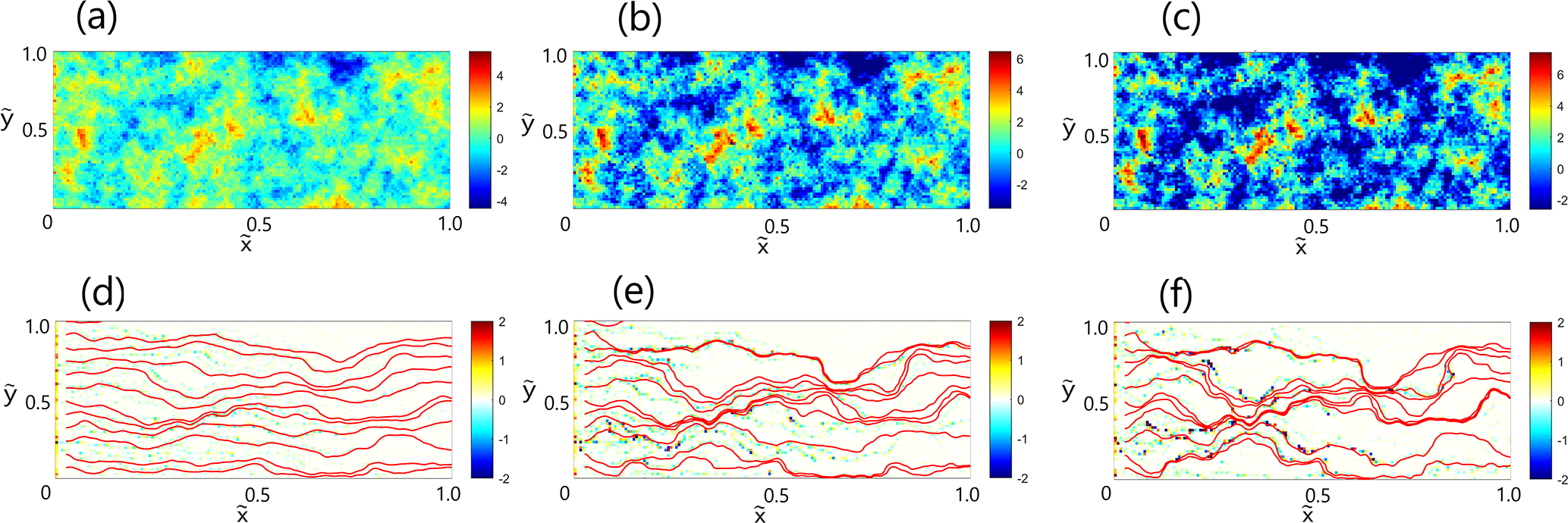 To understand the origins of emergence of preferential flow paths during chemical weathering of a calcite matrix, we first examine the overall traits in the spatial distribution of reactants and dissolution-precipitation reactions. Figure 3 presents the initial hydraulic conductivity field K0 for , 3, 5 (frames a–c) and the increment in hydraulic conductivity due to reaction-transport interaction relative to the initial field K−K0 at a dimensionless time , defined as , for , 3, 5 (frames d–f) – a single realization of the reactive process. Here, and are the normalized coordinate axes. Note that the color code range in frames (a)–(c) differs for better visualization. In frames (d)–(f), flow streamlines are denoted by red curves.