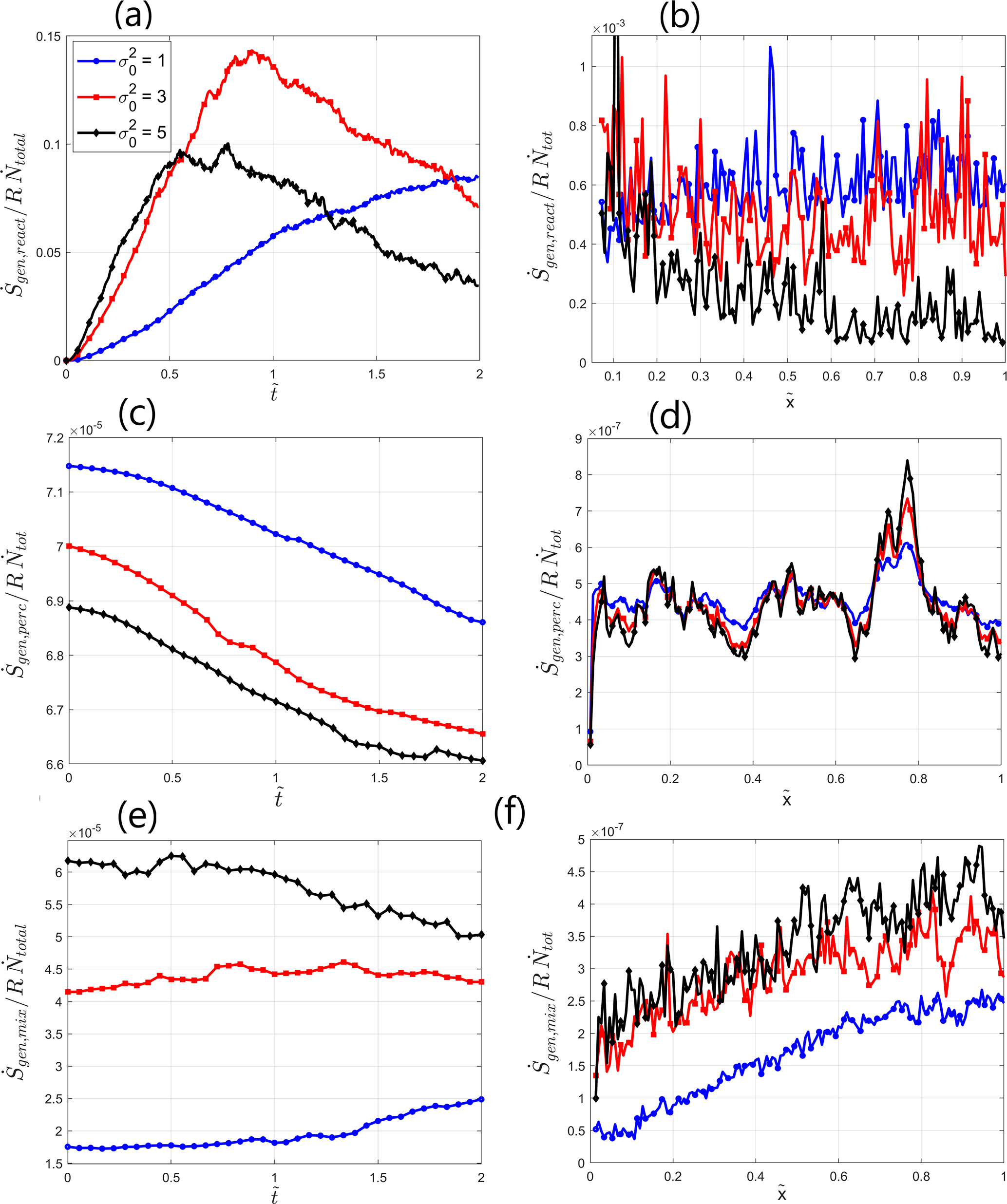 Figure 6d presents the normalized Percolative entropy generation rate at as a function of normalized distance from inlet . As a rule, the Percolative entropy generation for lower values is higher for most of the field, corresponding to the tendencies in Fig. 6c. Here, as opposed to the Reactive entropy generation, no clear spatial tendencies are observed, as the Percolative entropy generation rate remains approximately constant, except for local statistical fluctuations due to the heterogeneity of the porous medium (the fact that these fluctuations occur in similar regions for different σ0 values is not surprising, as the fields were created with identical seeds for SGSIM). This brings to mind intriguing associations with the Optimal channel network theory (OCN) and its application to drainage networks, as equal energy expenditure due to frictional dissipative process per unit channel area anywhere in the network is postulated by Rodriguez-Iturbe et al. (1992) as one of the three governing principles of optimal energy expenditure for a network. A disclaimer should be made that providing a full analogy to OCN is not intended in the current study, since to be able to do that we need to show that the principles of minimum energy expenditure in any link of the network and minimum total energy expenditure in the network as a whole are satisfied as well, which is well beyond the scope of this work. To summarize, the Percolative entropy generation results indicate lower free energy losses due to frictional dissipation through the matrix per unit flow as a result of the increasing transport channelization.