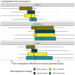 The analysis for the historical period shows that the choice of individual-member vs. ensemble bias adjustment and change-preserving vs. non-change-preserving bias adjustment impacts streamflow, temperature and precipitation performance, as well as precipitation and temperature variability. These differences may lead to discrepancies in the projection of future climate and hydrological extremes. Therefore, we investigate the differences in the projected climate signal and the signal-to-noise ratio due to the choice of the bias adjustment strategy compared to the signal projected by the raw (unadjusted) ensemble that we want to preserve. Further, we assess the impact of this choice on the time-of-emergence of both precipitation and streamflow.