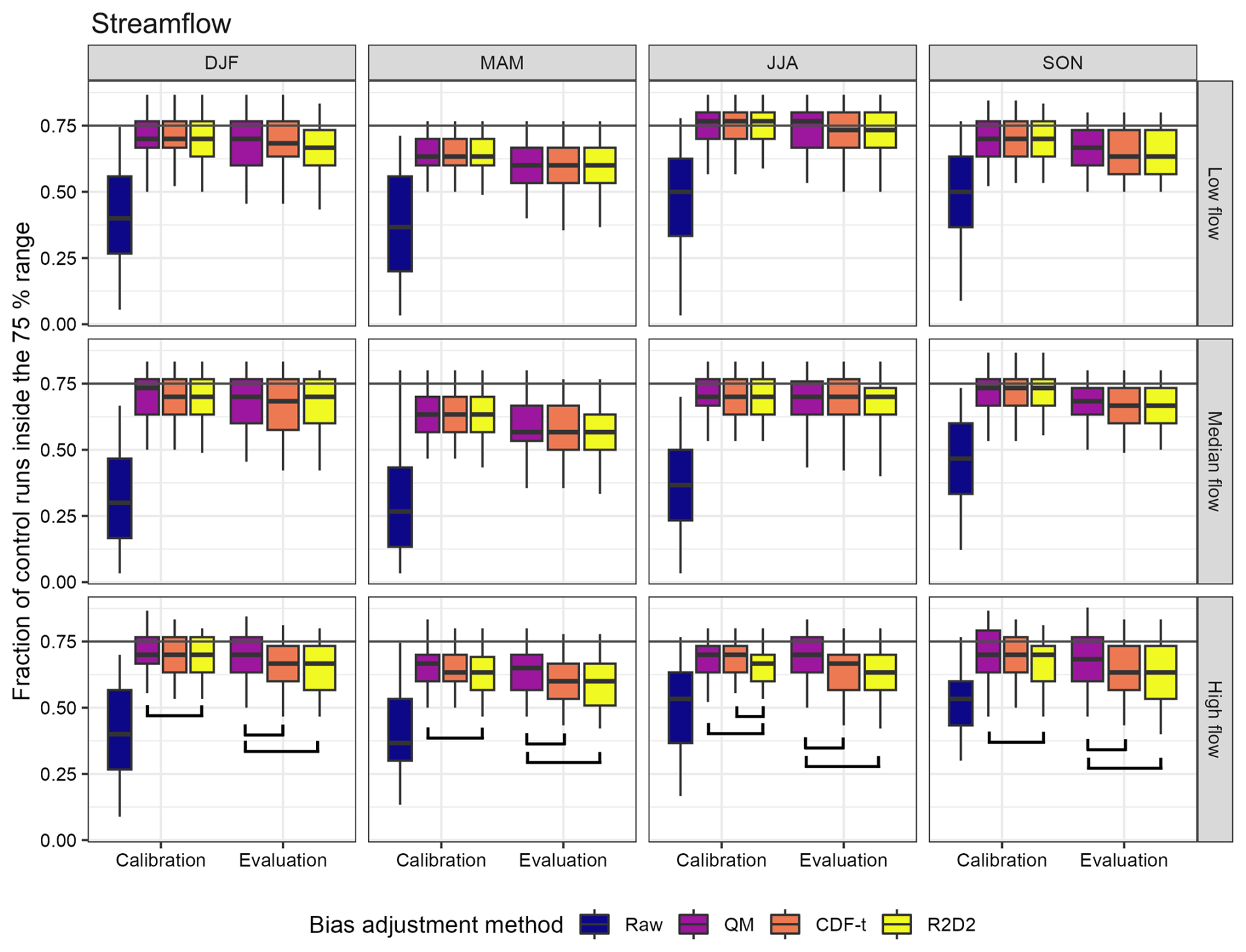 Figure 2Ability of the three bias adjustment methods and the unadjusted ensemble (raw) to reproduce streamflow statistics of the control runs (streamflow time series simulated by the hydrological model with observed precipitation and temperature inputs) for the 87 catchments. The fraction of control runs within the simulated 75 % confidence interval was calculated for four seasons (December/January/February, March/April/May, June/July/August, September/October/November) and three streamflow percentiles (1st, 50th and 99th). The optimum value of the performance criterion is 0.75. QM is the univariate non-change-preserving method, CDF-t is the univariate change-preserving method and R2D2 is the bivariate change-preserving method. All methods were run using the ensemble adjustment method. Calibration and evaluation combine both climatic sub-periods. Statistically different distributions are connected by black lines. These black lines are not plotted for the raw ensemble because its distribution significantly differs from all bias-adjusted distributions.