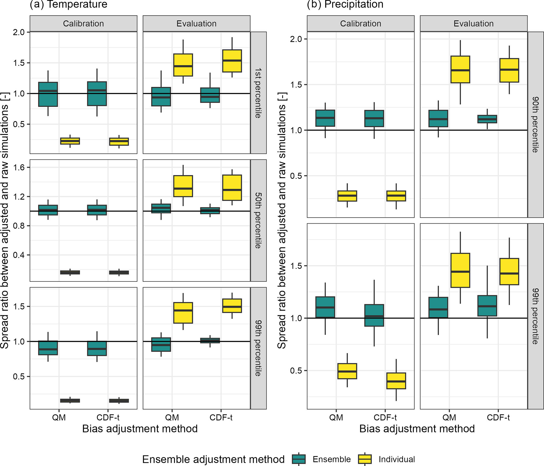 Individual-member adjustments clearly reduce the variability of the ensemble for the calibration periods (median values of the spread ratio are always lower than 0.25 for temperature and 0.5 for precipitation) but increase the variability of the ensemble for the evaluation periods (median values of the spread ratio are always higher than 1.3 for temperature and 1.4 for precipitation) for both temperature and precipitation percentiles and for both change-preserving and non-change-preserving methods. In contrast to individual-member adjustments, ensemble adjustments preserve the variability of the ensemble during both calibration and evaluation for most catchments and for both temperature and precipitation (median spread ratio is close to 1 in most cases). Note that for ensemble adjustments, the variability of the precipitation ensemble is, in most cases, larger than the raw variability, but to a much smaller extent than for individual-member adjustments.