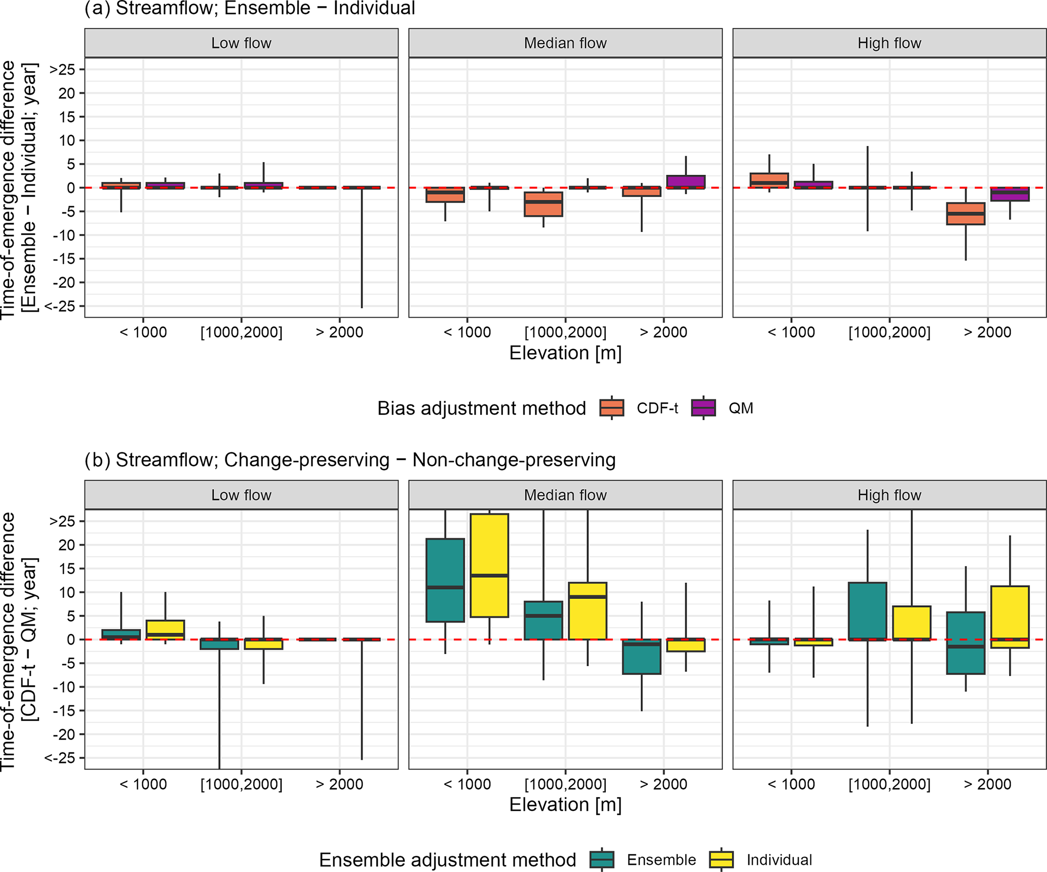 We now generalize these results for all catchments and low, median and high flows (10). We find no catchment differences in low-flow time-of-emergence between ensemble and individual-member adjustments (for both change-preserving (CDF-t) and non-change-preserving (QM) adjustments). However, ensemble adjustments lead to earlier time-of-emergence than individual-member adjustments for median flow at low and intermediate elevations (median differences of −1 and −3 years, respectively) and for change-preserving adjustments only (Fig. 10A). For high flows at low elevations, individual-member adjustments lead to earlier time-of-emergence than ensemble adjustments (median difference of 1 year for CDF-t) and later time-of-emergence at high elevations (median differences of 5 years for CDF-t and 1 year for QM). In that case, the differences are larger for change-preserving adjustments than for non-change-preserving adjustments. The differences in time-of-emergence between change-preserving and non-change-preserving adjustments are larger than those between individual-member and ensemble adjustments (Fig. 10B compared to A). For low flows, non-change-preserving adjustments lead to earlier time-of-emergence at low elevations (median of 1 year for ensemble adjustments and 2 years for individual-member adjustments), later time-of-emergence for 50 % of the intermediate elevation catchments, and no differences at high elevations. We find larger time-of-emergence differences for median flow than for low and high flows, especially at low elevations where non-change-preserving adjustments lead to earlier time-of-emergence (median differences of 11 years for ensemble adjustments and 13 years for individual-member adjustments). These differences are smaller at intermediate and high elevations. We do not see any clear pattern for high-flow time-of-emergence between change-preserving and non-change-preserving adjustments, but the differences are large for some catchments (e.g. 75th percentile of 11 years for individual adjustments at high elevations). Overall, we find large catchment differences in streamflow time-of-emergence for high flow and median flow, especially between change-preserving and non-change-preserving adjustments, while we find smaller differences for low flow.