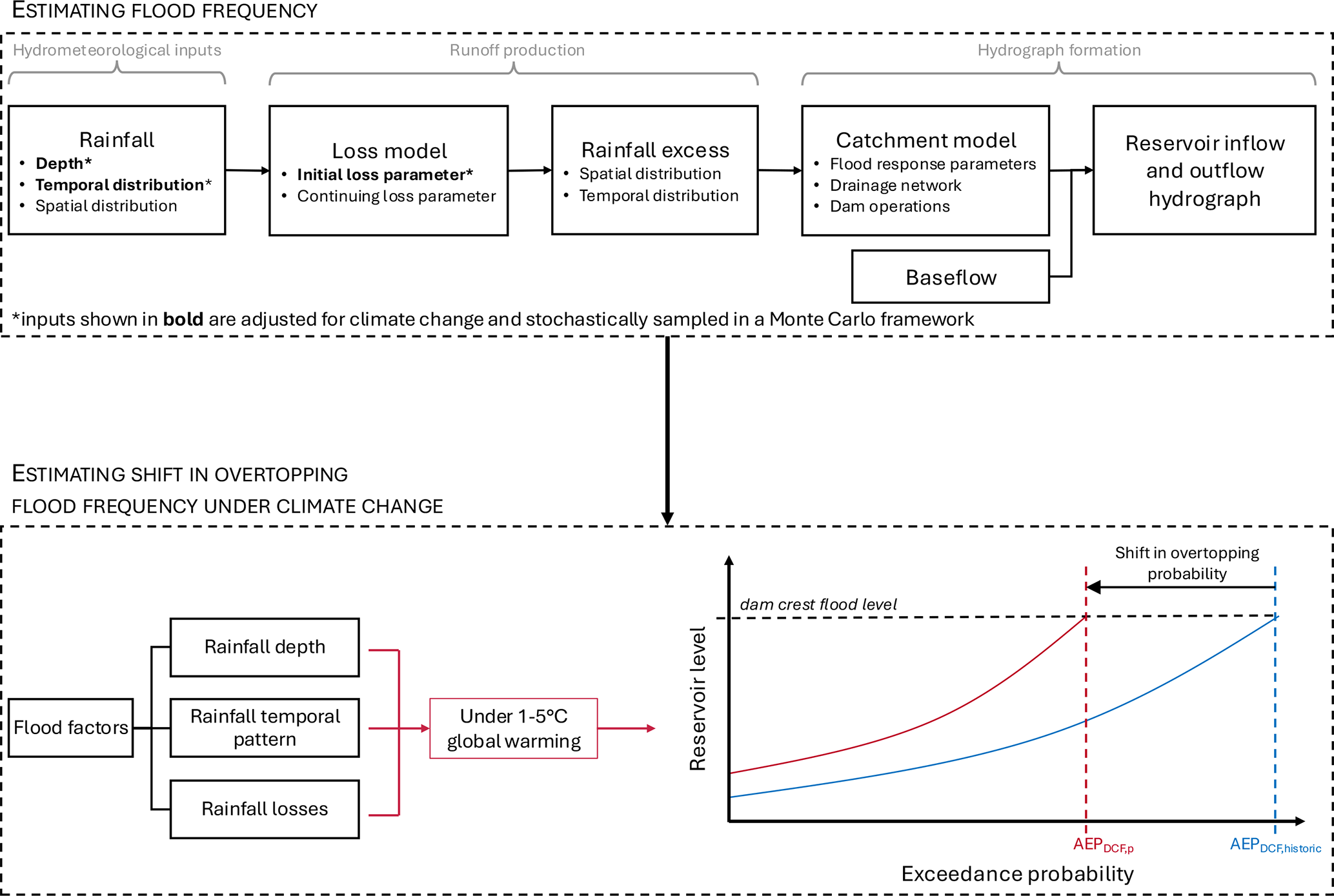 A confluence of factors are needed to ensure dam safety including adequate governance, appropriate industry practices, sound infrastructure management decisions, and sufficient consideration of aging infrastructure and, in more recent decades, the consideration of climate change (Shirzaei et al., 2025). Failure to address all dam safety factors has led to a number of high profile dam failure cases in the last decade (Ferdowsi et al., 2024; France et al., 2018) often with devastating impacts. The number of flood disasters has risen, more than doubling in the last two decades (Yaghmaei et al., 2020), and this is expected to continue increasing with global warming (Wasko et al., 2021a). The estimation of extreme flood frequencies is therefore essential for managing flood responses and mitigation strategies including planning, design, and management of infrastructure, emergency responses, and the setting of insurance premiums. The changing nature of rare floods under climate change is of particular concern with respect to large high-risk infrastructure such as nuclear power plants (Prasad et al., 2011) and large dams (Nathan and Weinmann, 2019a), where failures would threaten lives, livelihoods, and facilities integral to supporting economic activity. The theoretical basis for flood estimation under a stationary climate is a relatively mature science and a degree of consensus is reflected in national guidelines that are widely used in practice throughout many parts of the world (Wasko et al., 2021b). Similarly, methods for assessing dam overtopping probabilities have also been extensively studied (e.g. Cho et al., 2024, 2025; Hsu et al., 2011; Kuo et al., 2007; Kwon and Moon, 2006; Michailidi and Bacchi, 2017; Rajabzadeh et al., 2023; Wang and Zhang, 2017). However, it has long been recognised that global warming is changing the hydrological cycle (e.g. Mitchell, 1989; Trenberth, 1999) and hence changing flood frequency (Barnett et al., 2008; Matalas, 1997).
