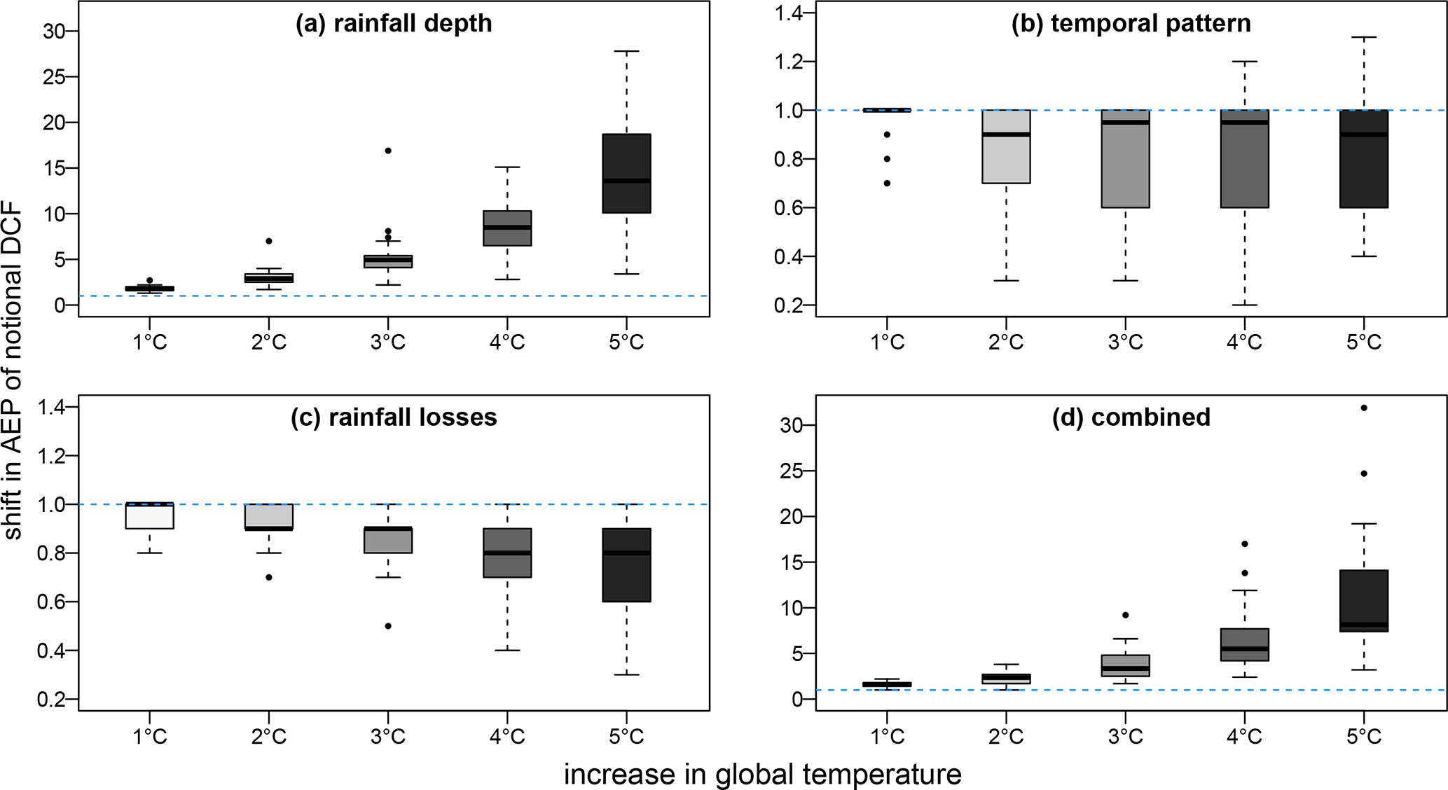 The shifts in overtopping frequency due to each flood driver are shown as box plots in Fig. 5a–c with Fig. 5d showing the response to the combined impacts of all three flood drivers. Each box plot is a summary of the results across the 18 dams. Global temperatures are currently more than 1 °C above the baseline time period used in this study and the probability of exceeding the DCF has already increased by up to 2.2 times and has more than doubled for two of the dams. For each flood driver, five box plots are shown representing increasing degrees of global warming. Similar to the results shown in Fig. 4, a comparison between Fig. 5a and d show that the AEP of the dam crest flood resulting from changes in all the flood drivers is most influenced by changes in the rainfall depth. However, the differences between Fig. 5a and d also reveal that the effects of changes in temporal patterns and rainfall losses are not negligible, despite their relatively small impacts when considered individually (see Fig. 5b and c noting the different scales on the y-axes compared to Fig. 5a and d). Interestingly, while the impacts of rainfall losses on reducing the probability of a dam crest flood are magnified with increased global warming, the impact of changes in temporal patterns do not necessarily change uni-directionally with increased global temperature. In addition, the direction of change in the storm temporal pattern was not indicative of the direction of change in the derived flood frequency curve. All catchments show decreases in the probability of a dam crest flood in response to 1–3 °C global temperature increases, while some of the catchments experience an increased probability of flooding under 4–5 °C of warming. These results indicate that changes in peak outflows in response to changes in temporal patterns are catchment specific and likely dependent on the catchment's time of concentration and other storm attributes such as the spatial distribution of rainfall.