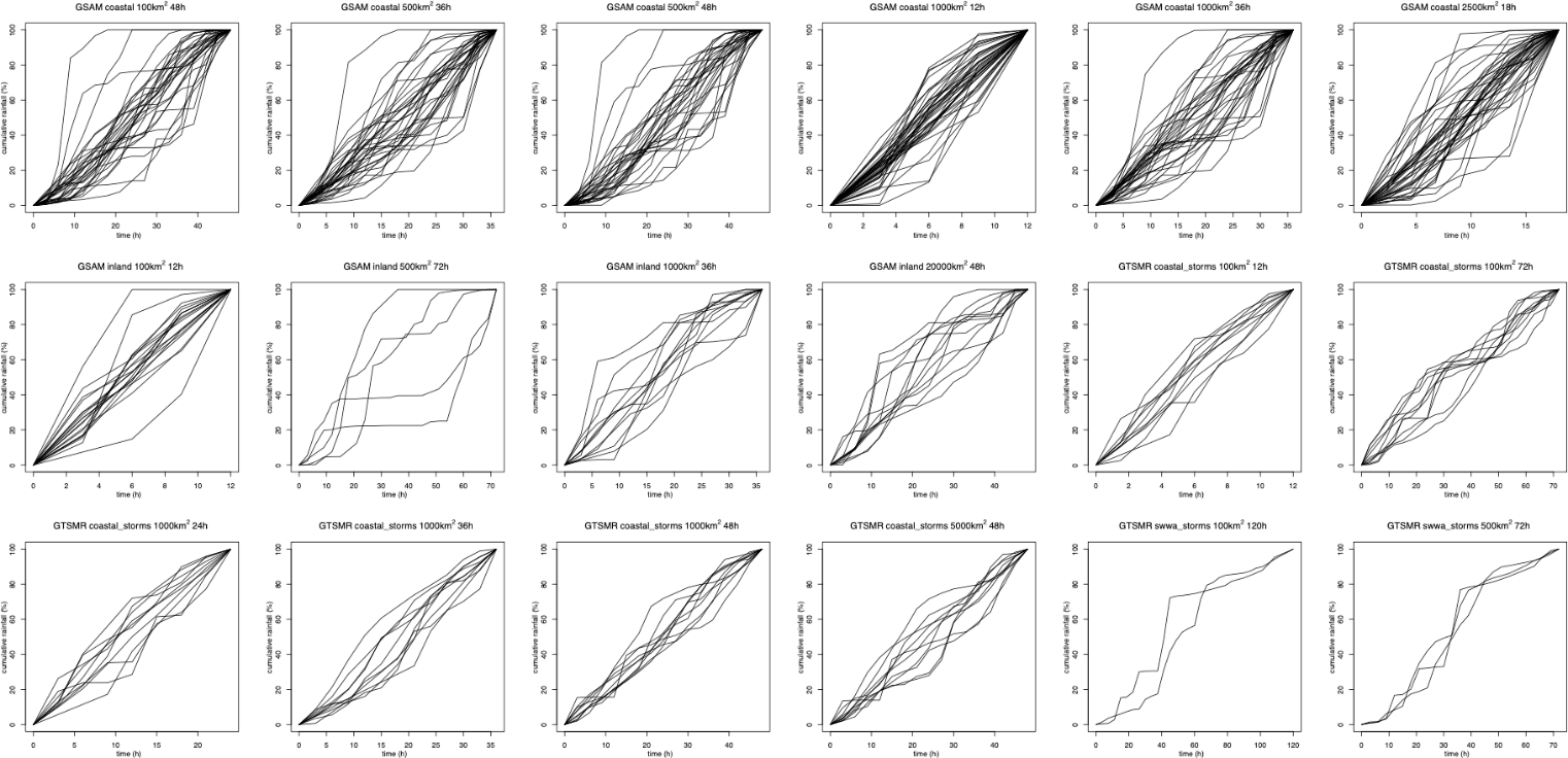 In addition to the sampling of rainfall depths, temporal patterns were stochastically sampled using a uniform distribution from an ensemble obtained from observed storms (Green et al., 2019), and initial rainfall losses were sampled from an empirical distribution based on the findings of Hill et al. (2014). The temporal patterns are dependent on the location and size of the catchment as well as the critical duration of the storm. The temporal patterns used in this study are shown in Figure A1.