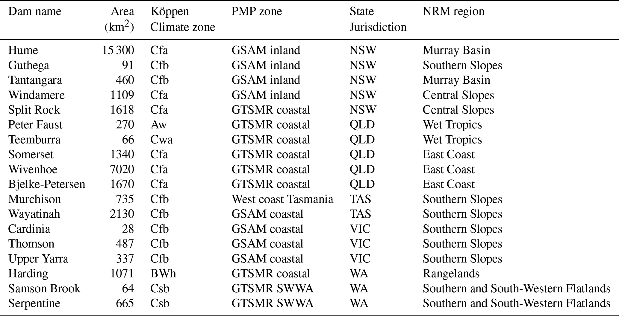 Table 1Catchment sizes, climate zones, PMP zones, and Natural Resource Management (NRM) regions of dam sites used for estimating shifts in the likelihood of overtopping floods under climate change.