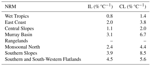 Projections of changes in rainfall losses were averaged over regions with similar hydroclimatic characteristics, termed “Natural Resource Management” (NRM) regions. These region-specific rainfall loss rates of change were derived from the results of Ho et al. (2023) but only used data from events that were equalled or exceeded on average once per year (1 EY), as opposed to the results presented in Ho et al. (2023), which included more common 5 EY events. The revised event selection was made here to help exclude the more frequent events where the soil moisture deficit may not have been fully satisfied by the incident rainfall. These regionally aggregated rainfall loss rates of change are documented in Wasko et al. (2024a) and are shown in Table 3 for the NRM regions relevant to the dams considered in this study. There was insufficient data to project changes in losses in the Rangelands NRM region. Consequently, values from the Monsoonal North NRM region were adopted as this was the closest proximity NRM region to the dam located in the Rangelands NRM region. The rates of change were applied to the mean parameter of the initial loss and to the constant value of the continuing loss.