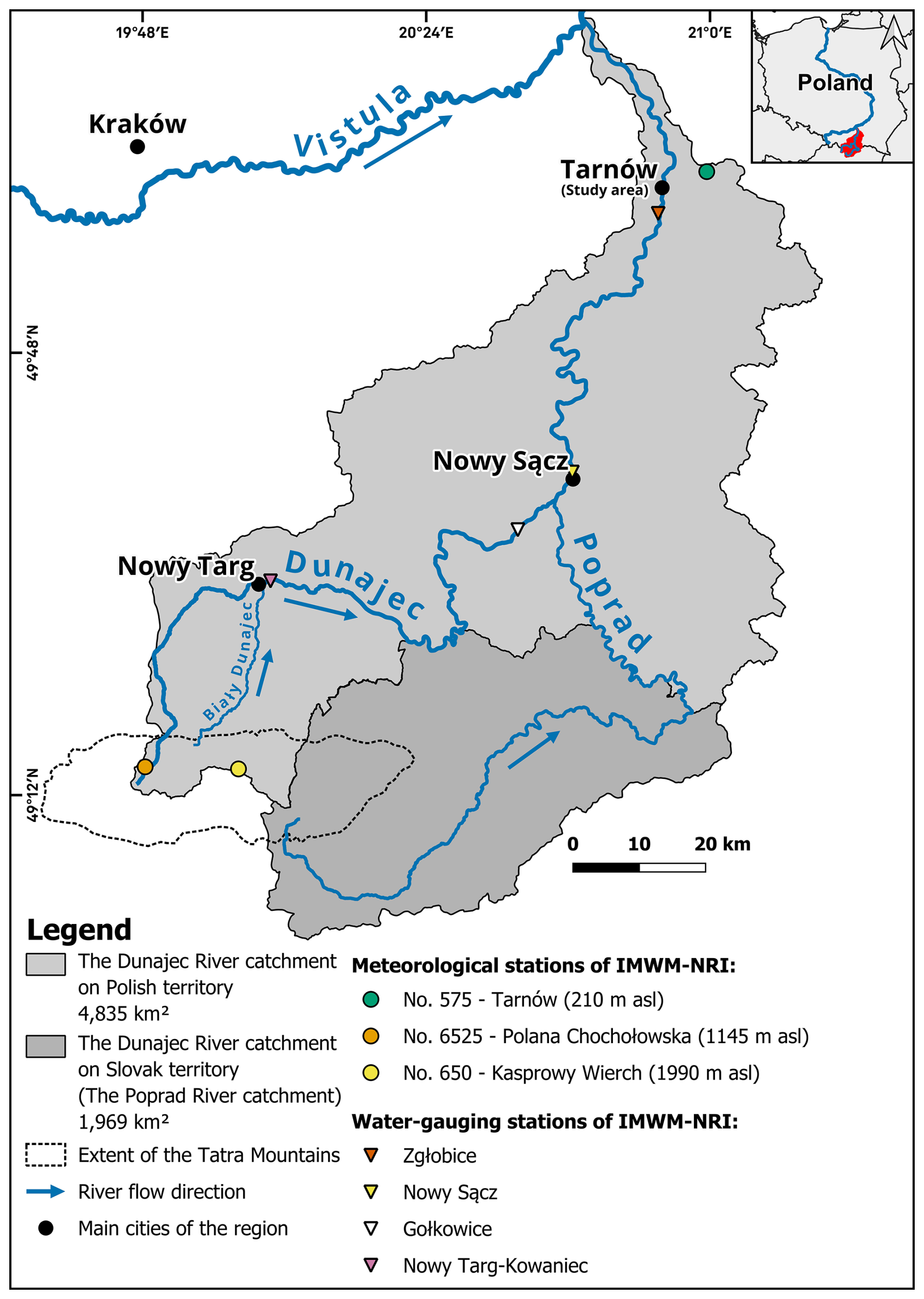 Figure 1The Dunajec catchment within the Polish and Slovak territories, indicating rivers and cities most relevant in this research, as well as considered meteorological and water-gauging stations.