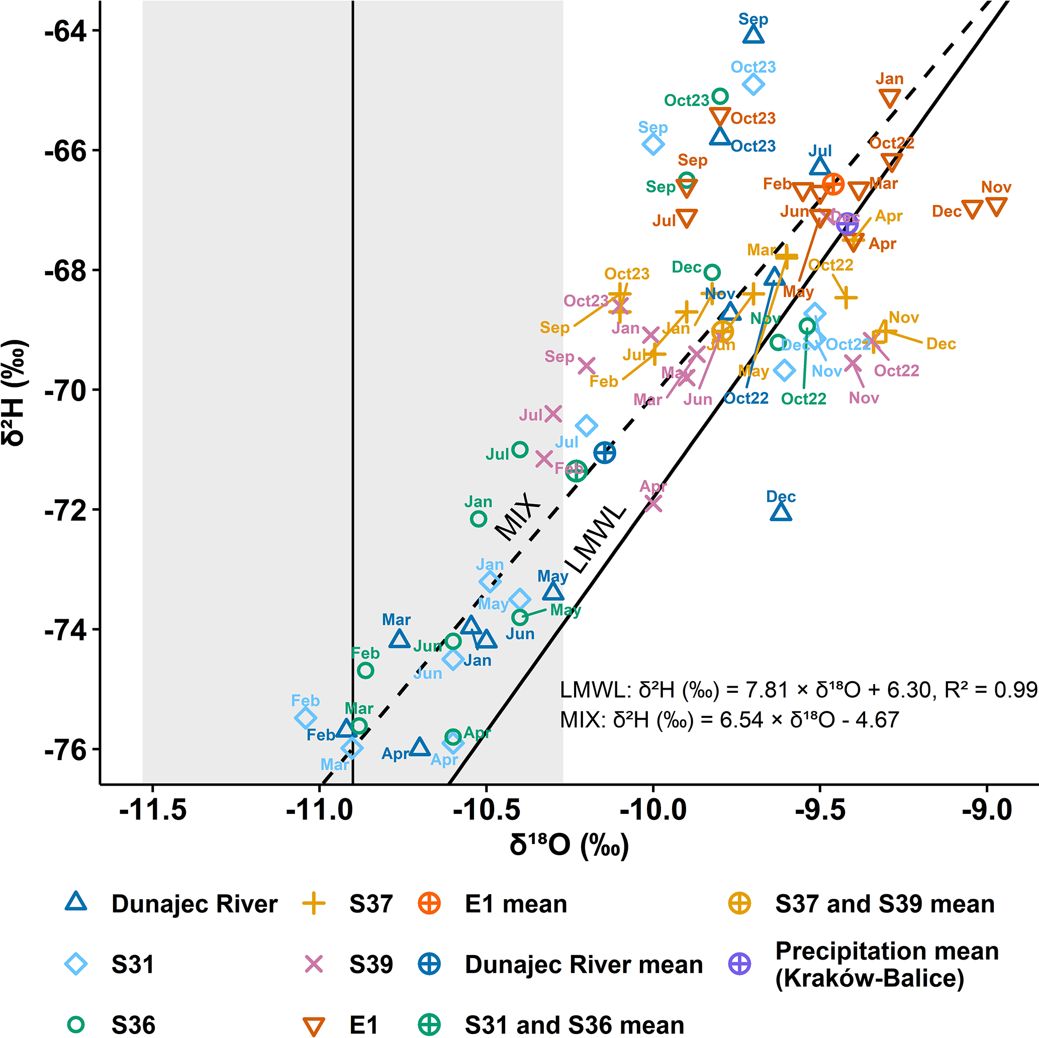 Figure 5Dual-isotope plot (δ2H vs. δ18O) showing delta-values of precipitation (Kraków), Dunajec River water, and groundwater samples from observation (E1) and production (S31, S36, S37, S39) wells. LMWL is the local meteoric water line, MIX is the water mixing line. Colours differentiate sampling locations, with symbols indicating monthly values and mean compositions. The vertical black line is the median value of δ18O in young groundwater within the Dunajec catchment. The grey area is the median ± standard deviation.