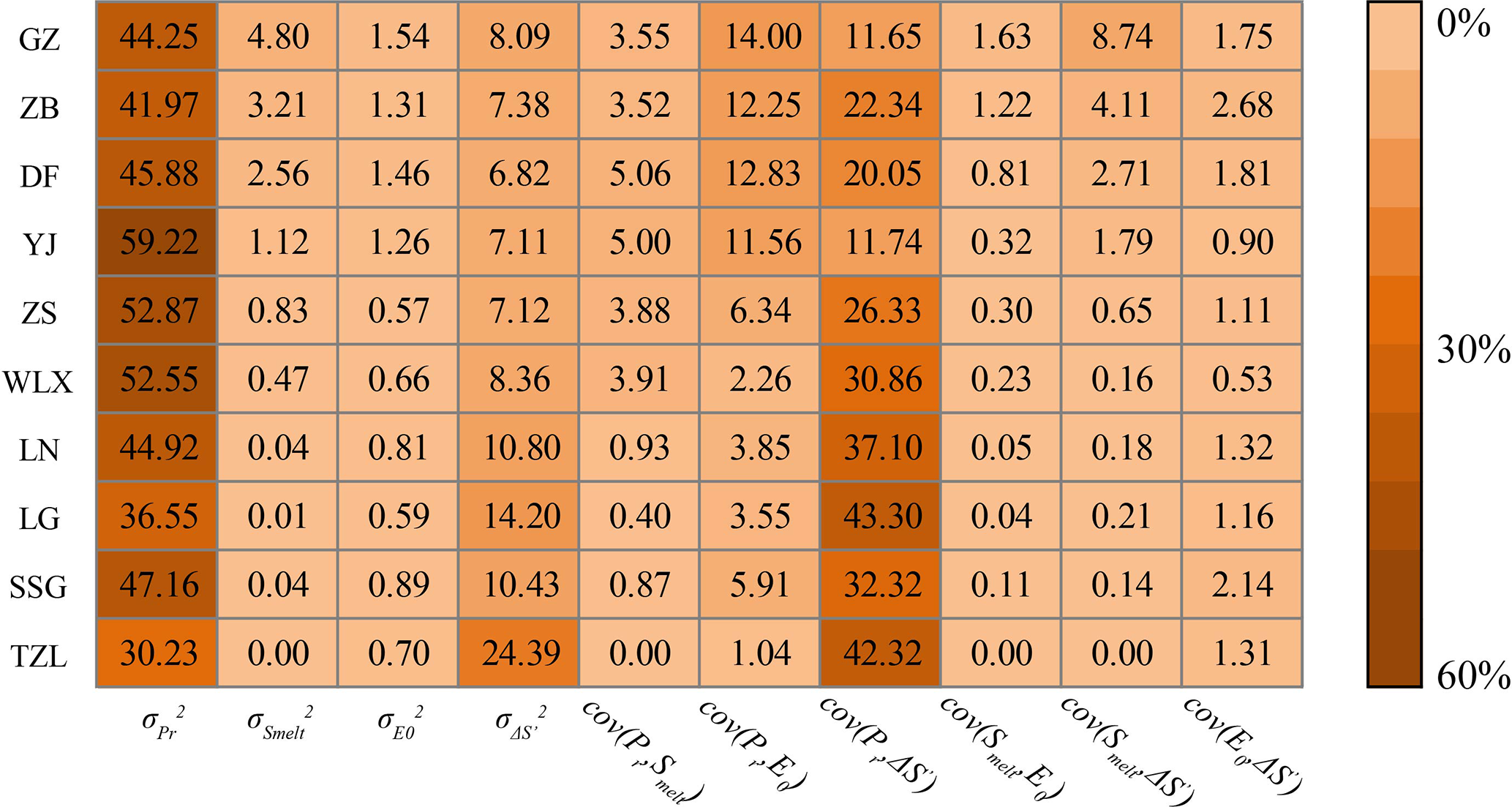 Figure 8Relative contribution matrix of how variances in different water balance terms (, , and ) and the covariances cov(Pr,Smelt), , cov(Pr,E0), , cov(Smelt,E0), and contribute to runoff variance () during the period 2002–2016 in all sub-basins. The colors indicate the degree of contribution.