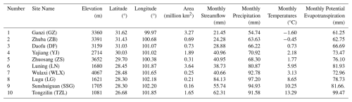 Table 2Location of outlet stations in 10 sub-basins and basic hydrological and meteorological information.