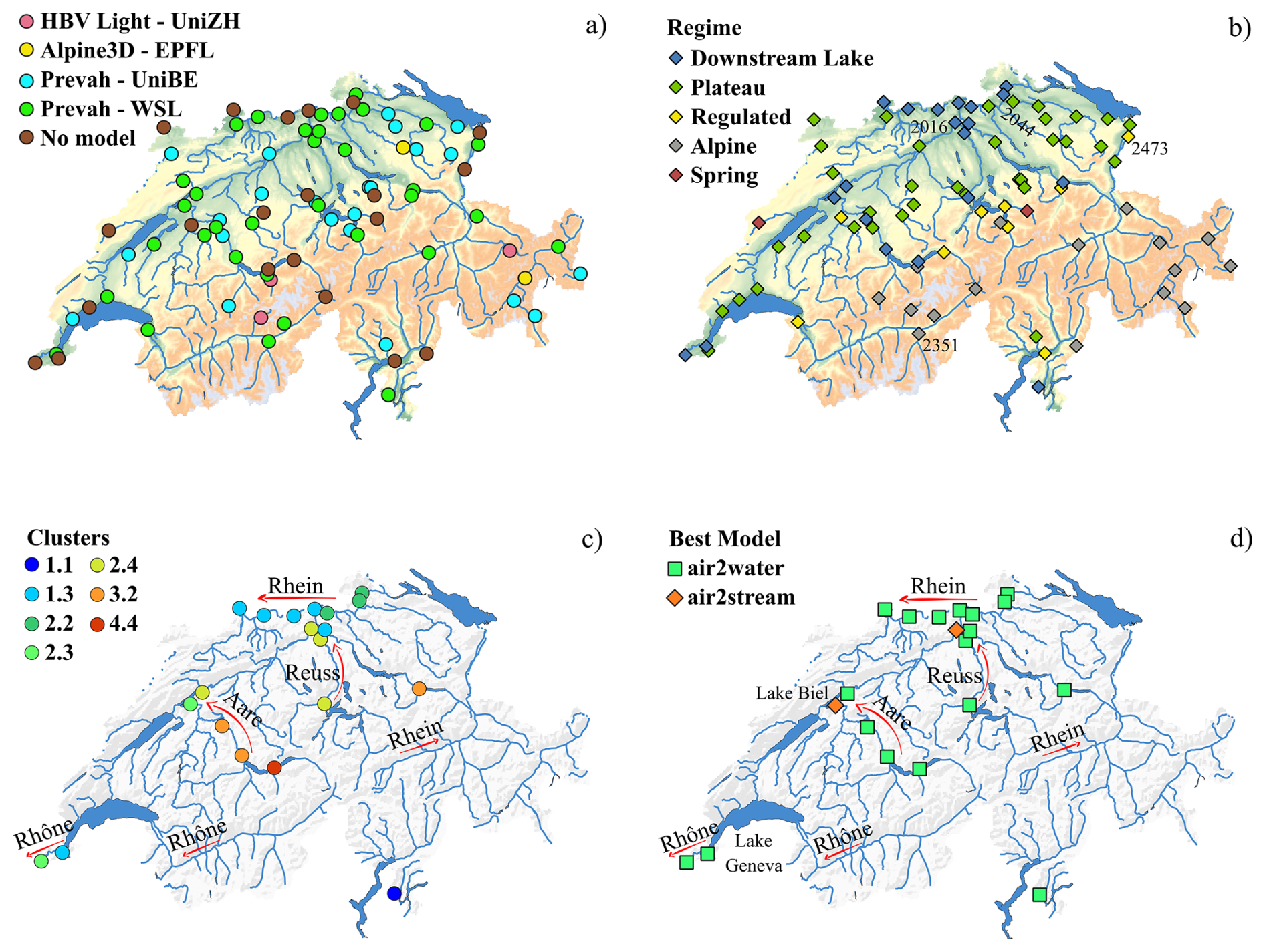 Figure 2(a) Investigated FOEN stations with available and used hydrological models providing future projections of river flow, (b) station thermal regimes, (c) Downstream Lake clusters, and (d) best-performing surface water temperature model at Downstream Lake stations. Red arrows show river flow directions. The coordinate reference system is the Swiss LV95. The background map is the DHM25, http://www.swisstopo.admin.ch/de/geodata/height/dhm25.html (last access: 1 September 2025).