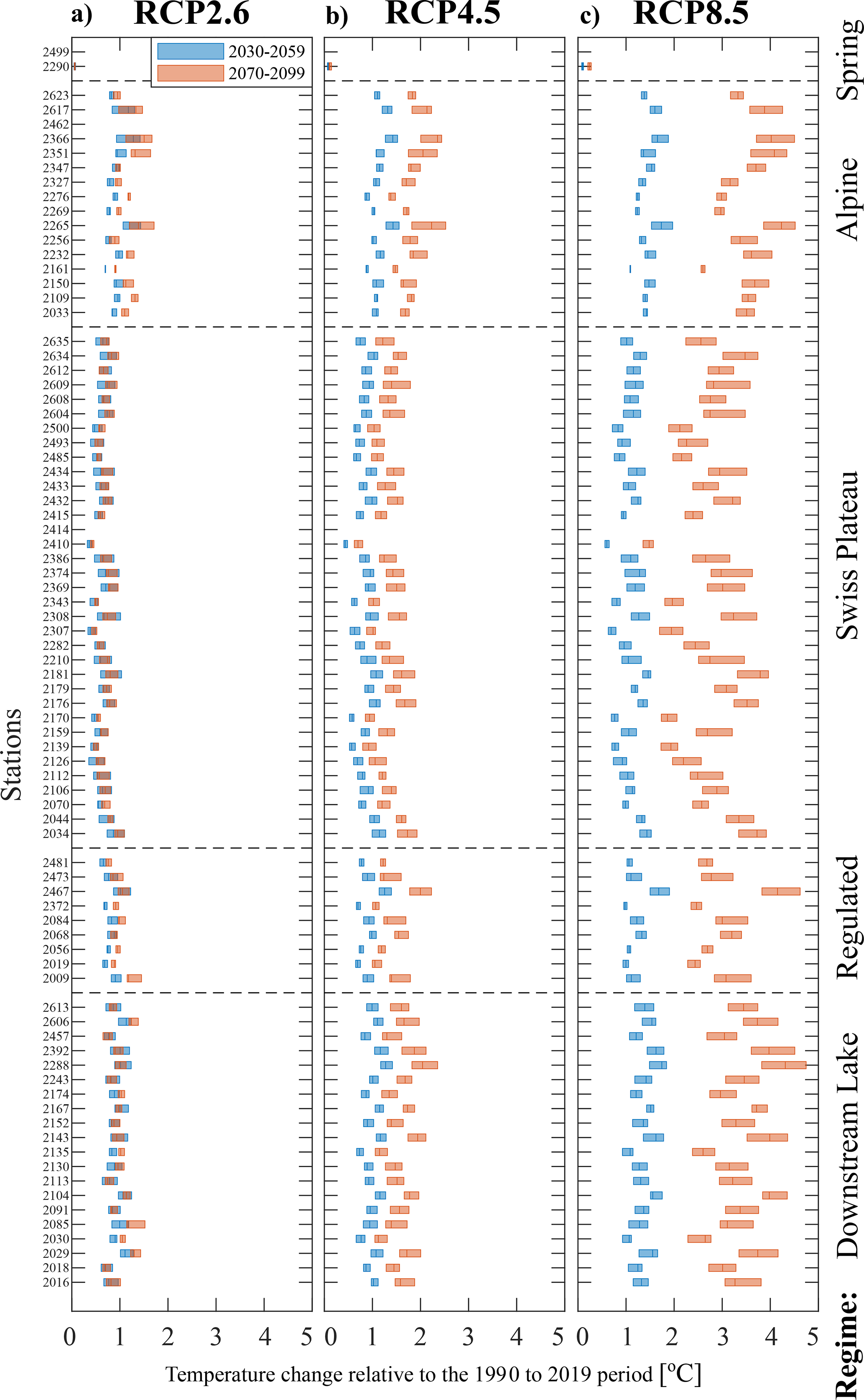 Climate change impact was heterogeneous between stations, yet common patterns were found within thermal regimes (Fig. 4, Table S8 in Sect. S2). The strongest river water warming, regardless of climate scenario or time period, was observed for stations in the Alpine thermal regime, followed, in order, by Downstream Lake, Regulated, Swiss Plateau, and Spring thermal regimes. Under RCP8.5, on average, the river temperatures of Alpine stations warm by 1.44 °C until the near-future and by 3.54 °C until the far-future compared to the reference period. The river water of Downstream Lake stations also warmed strongly by 1.36 °C until the near-future and by 3.43 °C until the far-future. Compared to the Alpine and Downstream Lake thermal regimes, river temperatures of stations in the Regulated (near-future: +1.19 °C; far-future: +3.00 °C) and Swiss Plateau (near-future: +1.06 °C; far-future: +2.75 °C) thermal regimes warmed less. Least affected, by a wide margin, were the river temperatures of the two stations that can be classified as being in the Spring thermal regime (near-future: +0.04 °C; far-future: +0.10 °C).