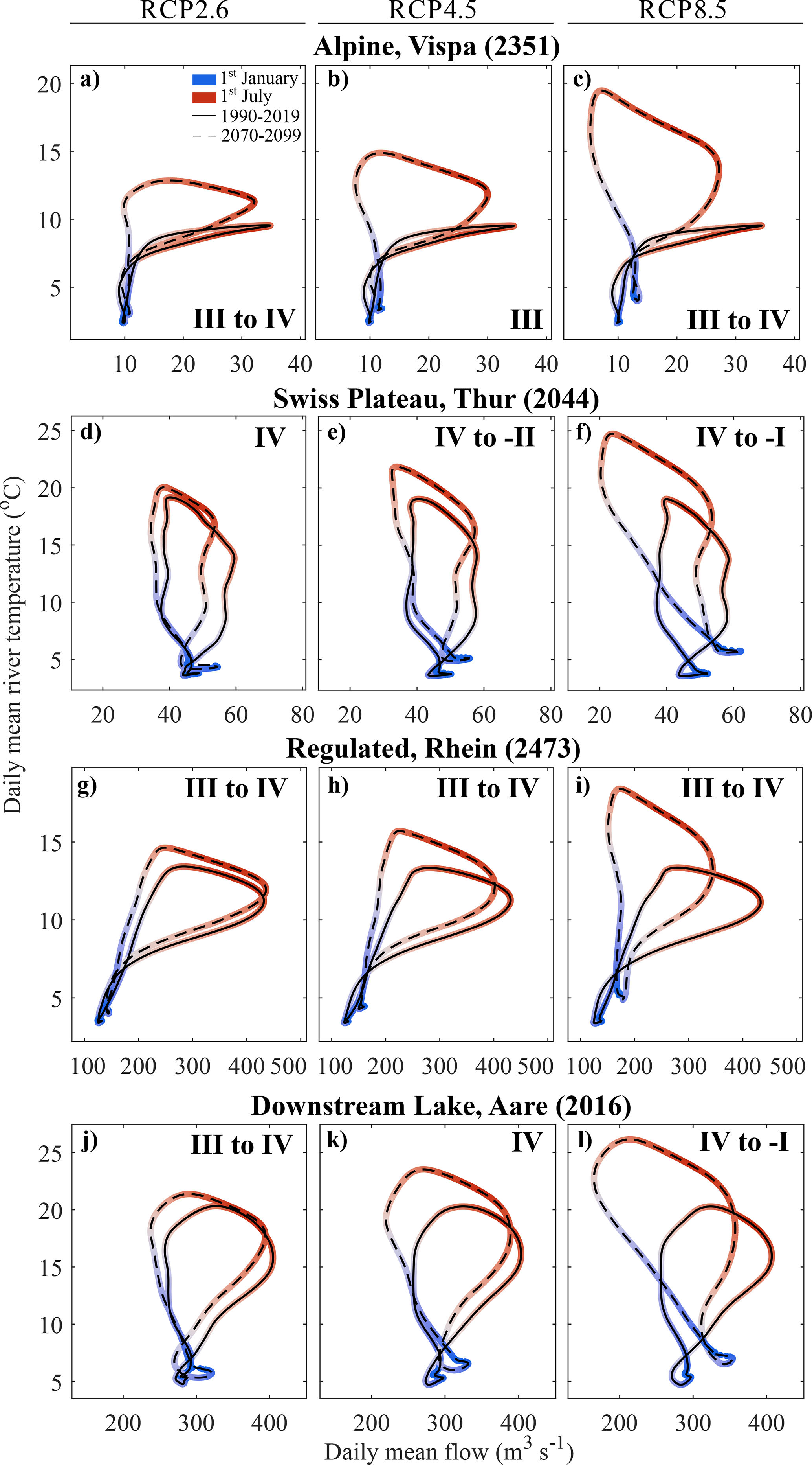 Here, we use Zuecco classes I to IV (Fig. 3, left column), which represent the interaction between flow and water temperature for the cases of datasets starting with low temperature and low flow. However, mainly in the Swiss lowland at the beginning of a year, rivers can display a situation where the temperature is cold (low) and flow is high, followed by a higher temperature in spring combined with less water. This process has been shown to be enhanced by the ongoing climate warming through the shortening or elimination of snow cover and glacial melt (FOEN, 2021; Michel et al., 2020; Van Vliet et al., 2013).