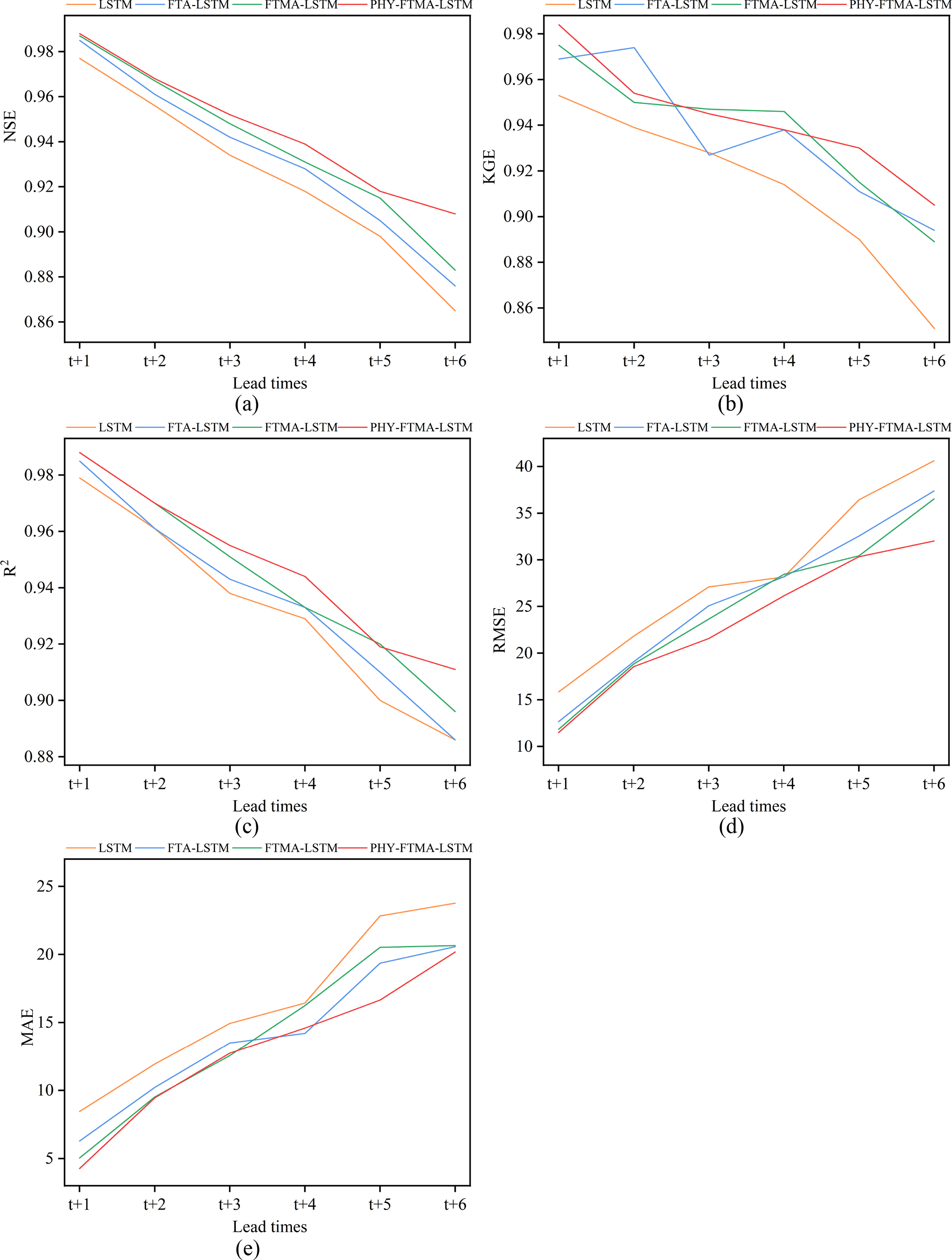 Figure 5Performance of the four models for flood forecasting at different lead times for validation (a) NSE, (b) KGE, (c) R2, (d) RMSE, and (e) MAE.