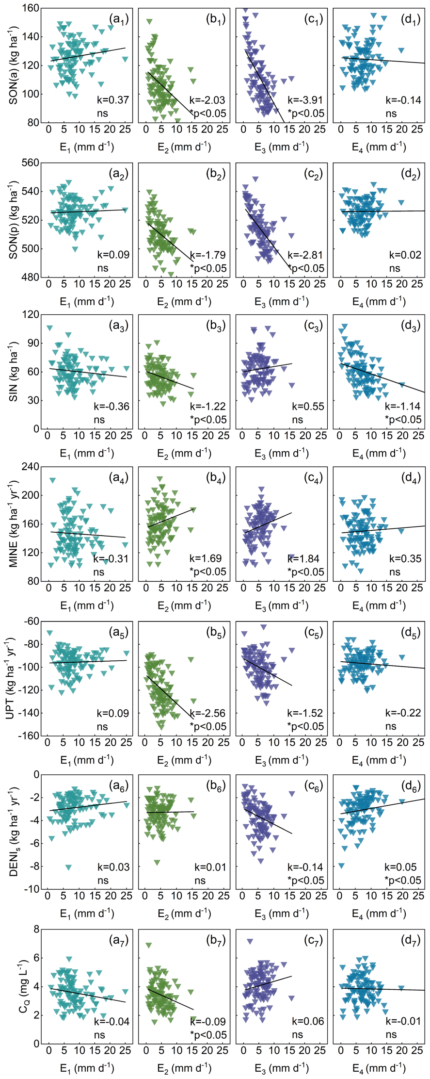 Figure 11The responses of N loads, mineralization, plant uptake, and denitrification (in soil) fluxes, as well as in-stream nitrate concentration (CQ) to the average rainfall intensity of the four seasons (E1E4). The sign and magnitude of the slopes (k) in these linear relationships denote the direction and intensity of the response of N dynamics to the variations in average rainfall intensity, respectively. Asterisks indicate the significance of the regression slopes (p<0.05); ns denotes non-significant relationships (p≥0.05).
