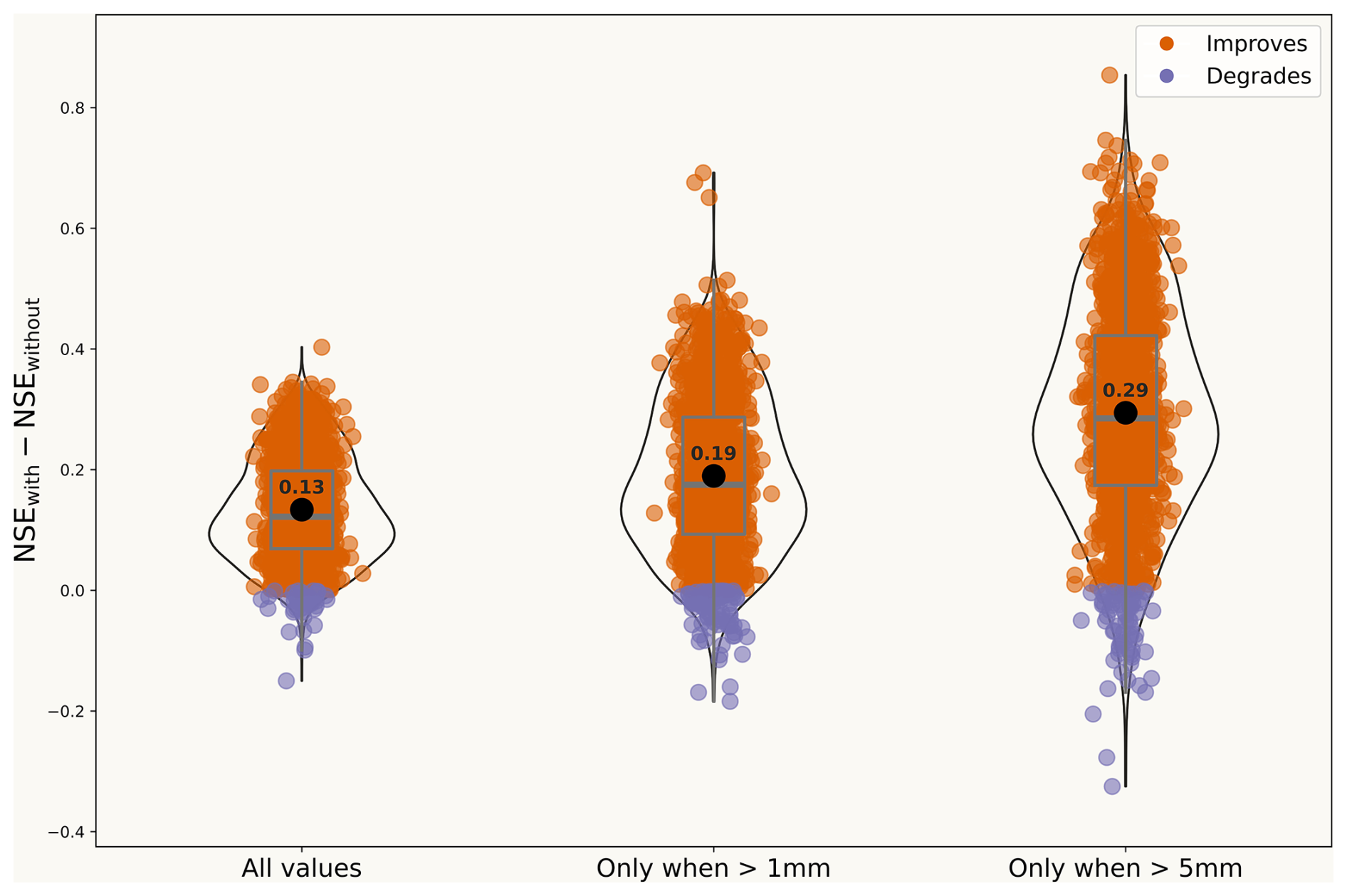 Figure 2Comparison of performance gain for the with_discharge vs. without_discharge models in NSE for different precipitation amounts. The first violin plot illustrates the average improvement across all days in the testing period. The second and third plots display the mean performance gains over the catchments, specifically focusing on days where precipitation exceeded 1 and 5 mm, respectively.