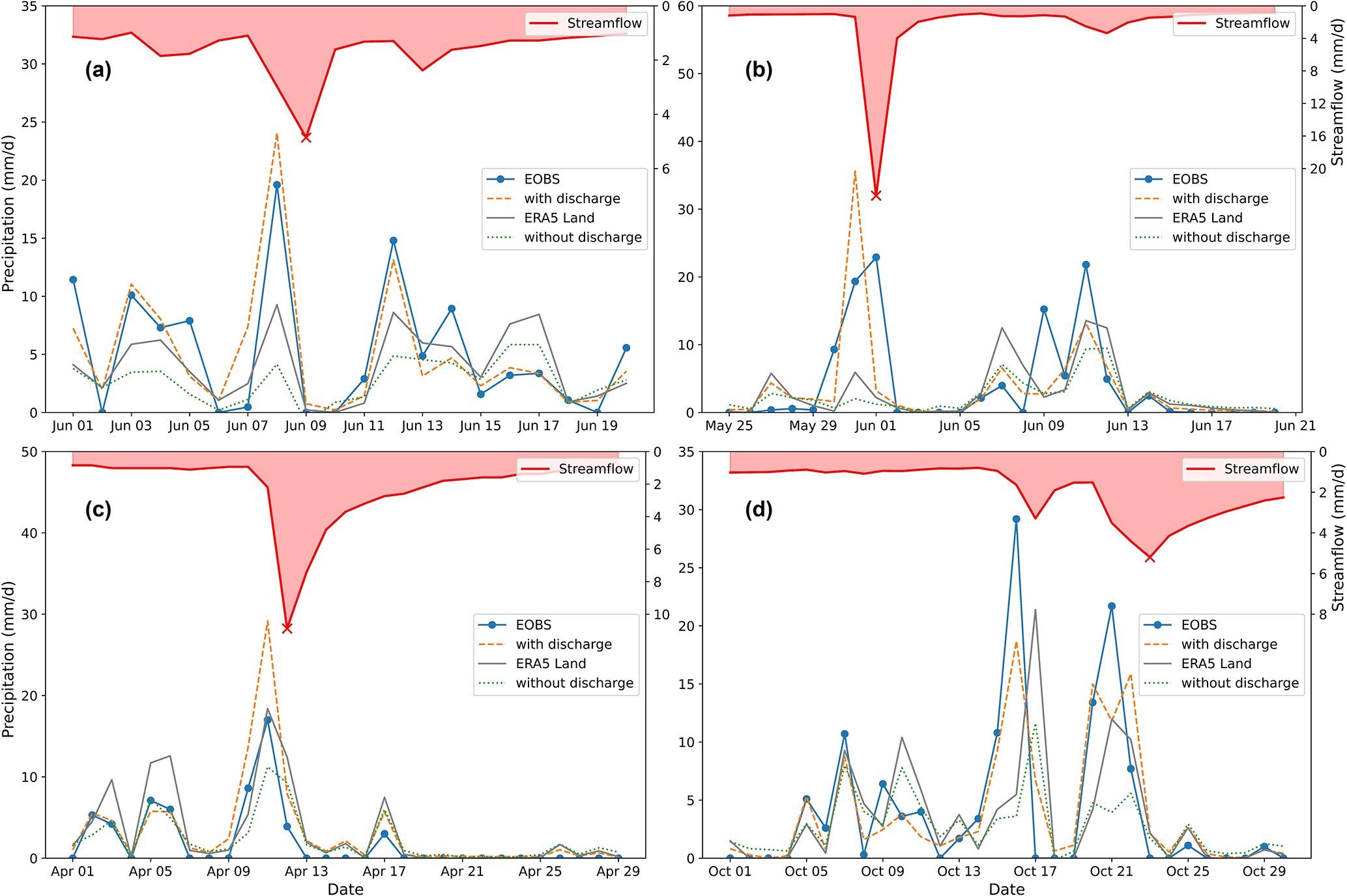 Figure 4Precipitation estimates for flood events at four out-of-sample catchments: (a) Elsenz Schwarzbach, (b) Ernz, (c) Sueiro, and (d) Hoelzlebruck. The red line represents the observed daily streamflow, with a cross marking the day of the flood event. The orange curve indicates the precipitation predicted by the with_discharge LSTM model, while the green curve shows the precipitation predicted by the without_discharge model. The blue line reflects the original gauge-based EOBS time series, and the grey line represents the estimate from the ERA5 Land.