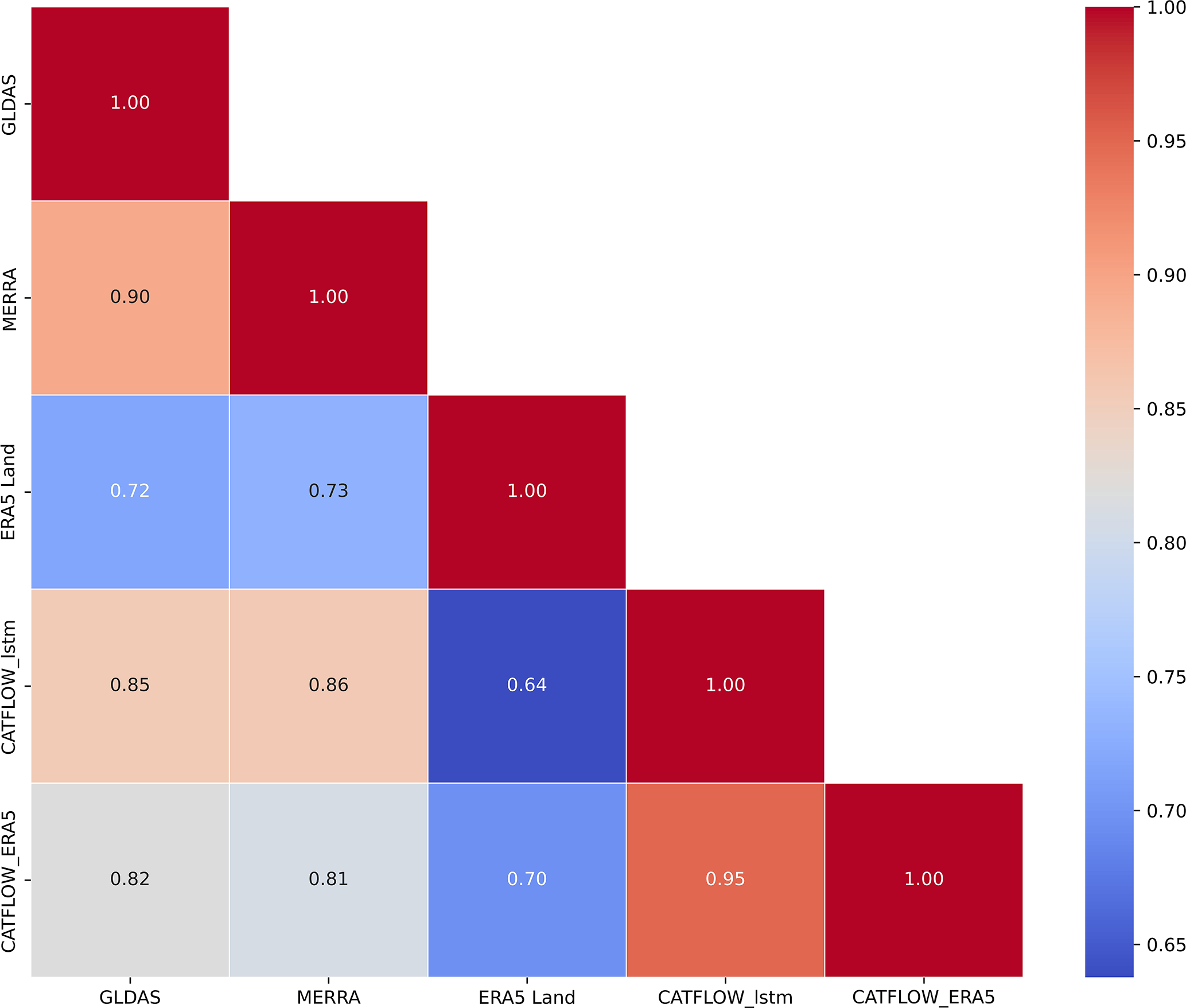 To understand the evolution of soil moisture dynamics while using the with_discharge LSTM-based precipitation estimates in physically based models, we conducted a hillslope-scale CATFLOW model simulation (Loritz et al., 2017; Manoj J et al., 2024) in one of the headwater catchments in Elsenz Schwarzbach (ERA5 Land vs. with_discharge LSTM). The pairwise correlation values, as shown in Fig. 7, indicate that the use of the LSTM-based precipitation estimates does not lead to a loss of information regarding soil moisture dynamics in the region. In fact, we observe a slight increase in correlation when comparing the inversely derived precipitation estimates (referred to as CATFLOW_lstm) to MERRA and GLDAS (Table 1), in contrast with the correlation obtained for the run with ERA5 Land (referred to as CATFLOW_era5). As expected, the correlation value for the ERA5 Land run is slightly higher when assessed against soil moisture from the same ERA5 Land dataset, which may be attributed to model biases arising from using the same dataset for both precipitation and soil moisture.