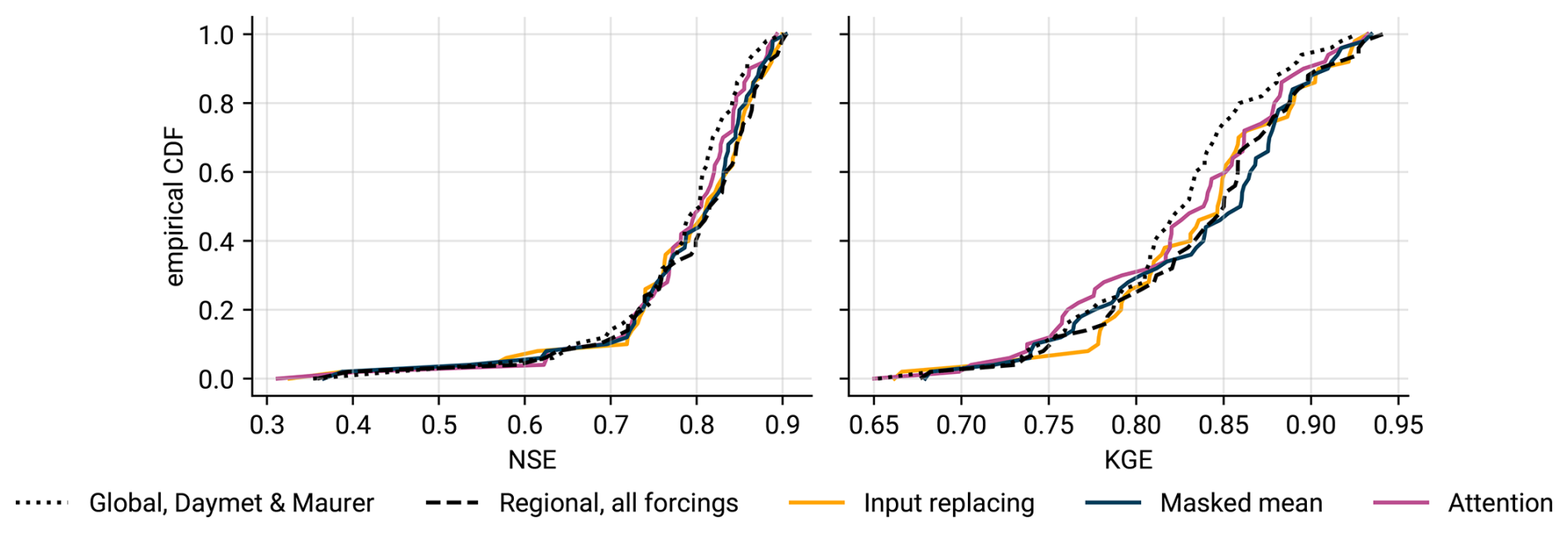 The last experiment investigated how well the missing-input architectures can incorporate regional input data, i.e., forcings that are available only in a subset of the training basins. Figure 8 shows the resulting empirical CDF curves of NSE and KGE values, and Appendix C provides figures with additional metrics.