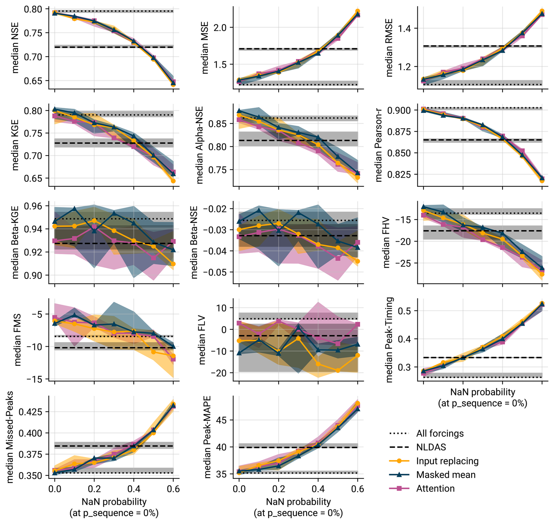 This experiment simulates short-term outages of certain input products. Because the LSTMs used in hydrologic applications typically ingest input data with one year (365 d) of lookback, even an outage for a single time step can cause problems for the next year to come: for the next 365 d, there will be a NaN input time step, which breaks models that cannot deal with missing input data. We trained and evaluated the different models with an increasing probability of randomly missing input time steps. The time step dropout is sampled independently at random, i.e., at each input time step, each forcing is missing with probability ptime. This means that all products can be missing at once for certain time steps. We sweep ptime from 0 to 0.6 in increments of 0.1.