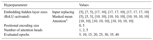 All hyperparameter tuning experiments used ptime=psequence=0.1. We chose these values as an intermediate level of missing data to avoid the computational expense of tuning each architecture for each experiment setup separately. As we built upon the established baselines from Kratzert et al. (2021), we did not tune the LSTM architecture itself for the experiments in this paper. Hence, all LSTMs are trained with 365 daily input time steps, a hidden size of 256, batch size 256, dropout fraction of 0.4 on the output head, and an Adam optimizer with initial learning rate of 1×10-3, which we lowered to 5×10-4 in epoch 10 and to 1×10-4 in epoch 25. We used the NSE* loss function from Kratzert et al. (2019). For a more in-depth description of these settings, we refer to Kratzert et al. (2019).