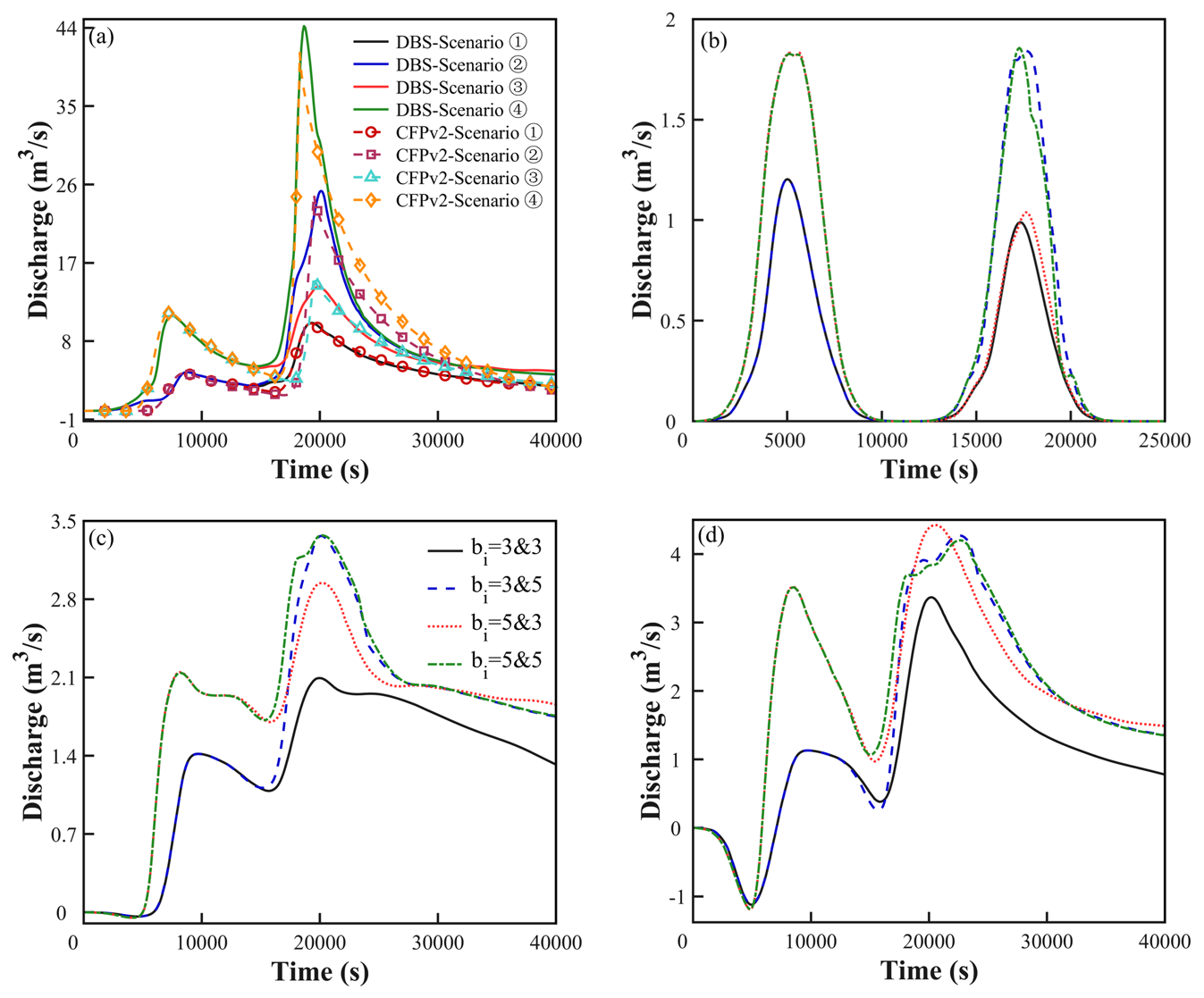 Based on the comparison between DBS and Modflow-CFPv2 results in Fig. 4a–c, the CFPv2 model exhibits a single-peak hydrograph with exponential recession characteristics, failing to capture flow process line disturbances caused by multi-media interactions. Under precipitation intensities b=3 and 5, the CFPv2 model shows an immediate rapid increase in stream discharge during early stages rather than gradual enhancement, though total discharge and baseflow during later stages remain comparable (as shown in Table 3). Specifically, for b=3, the peak stream discharge in Modflow-CFPv2 occurs at 2520 s, earlier than in the DBS model. This discrepancy arises because the precipitation recharge package in CFPv2 directly elevates water levels, whereas the DBS model simulates a gradual vertical infiltration process along the z axis. Lower precipitation intensity reduces groundwater infiltration rates and prolongs water table replenishment time, consequently delaying lateral discharge timing. At b=7, both models exhibit comparable first discharge peaks, but the DBS model generates a secondary peak through overflow effects that rapidly recedes after overflow cessation. In contrast, CFPv2 demonstrates smooth exponential recession without secondary features due to its simplified vertical stratification that neglects multi-component interactions.