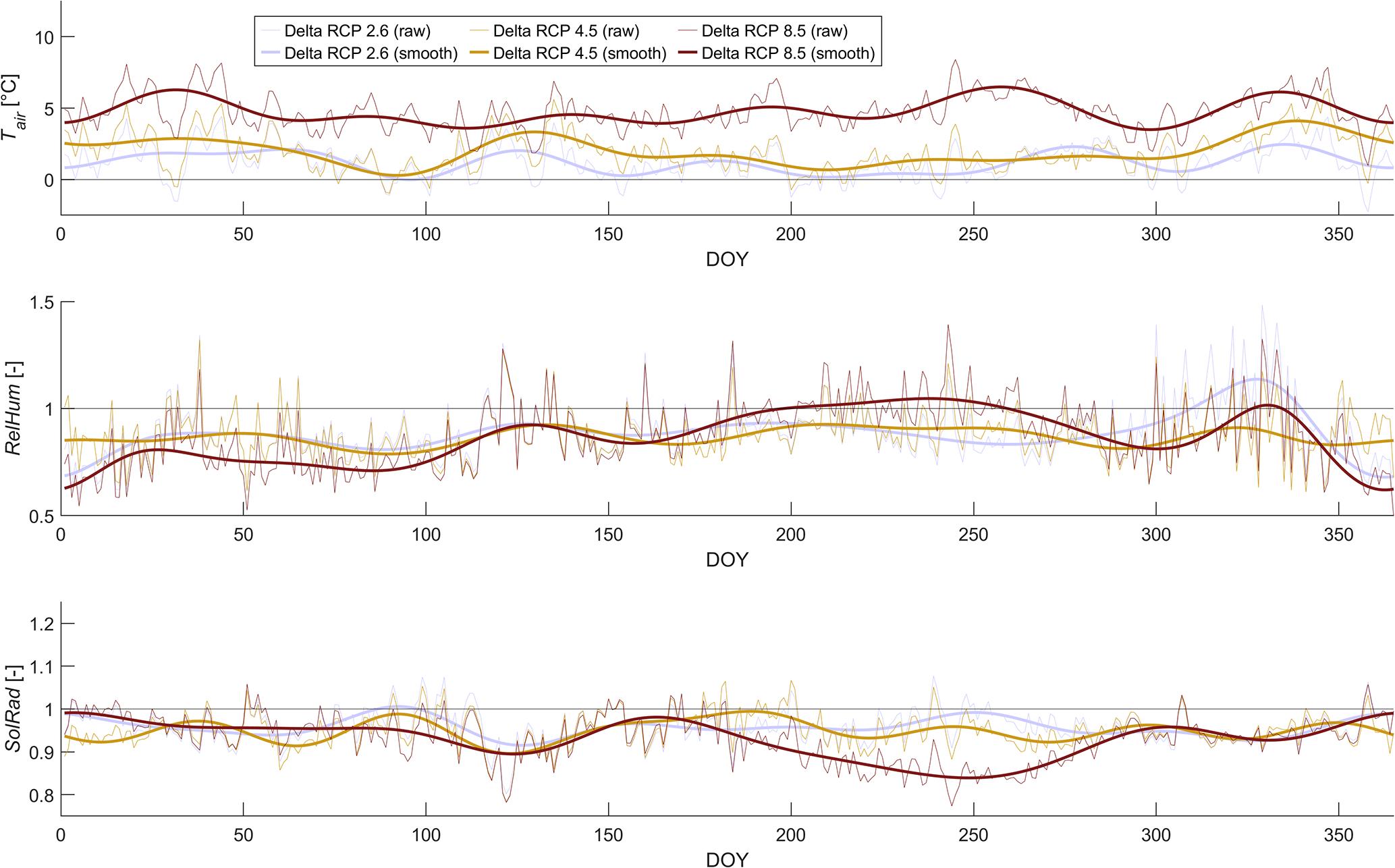 Figure 2Delta computed for 3 different RCPs (time-horizon 2080–2090) based on raw and smoothed timeseries for air temperature (top), relative humidity (middle) and solar radiation (bottom) versus day of year (DOY).