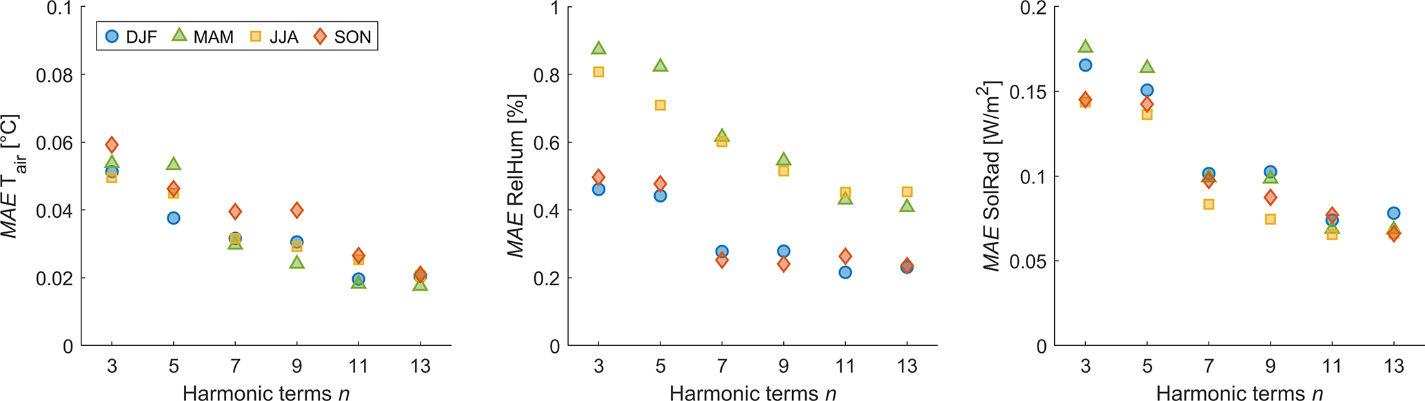 Figure 3Seasonal mean absolute error (MAE) between historical timeseries and timeseries smoothed with n harmonic terms for air temperature (left), relative humidity (middle) and solar radiation (right).