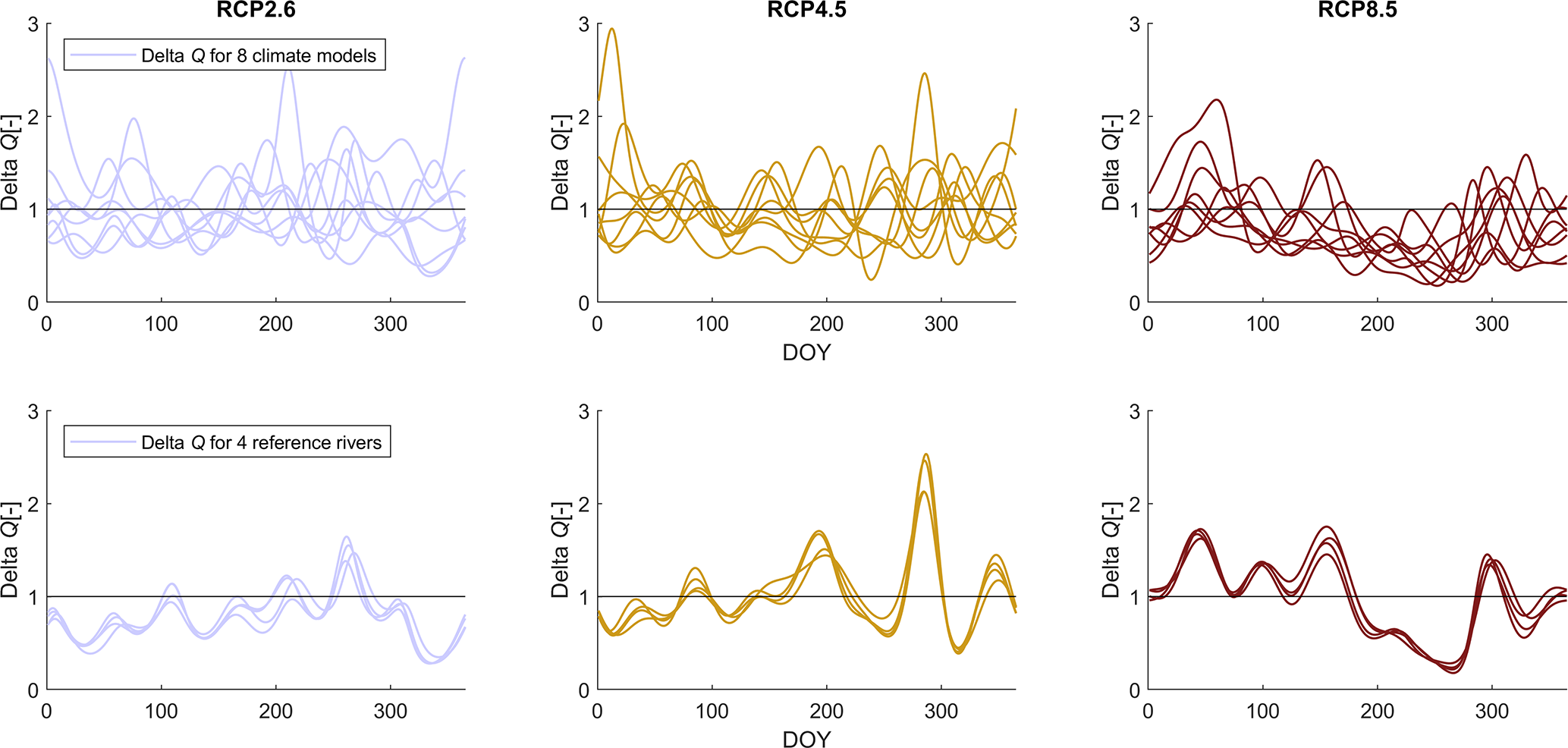 Figure 4Variability of the smoothed discharge-delta computed based on different climate models but on the same reference river (top) and based on 4 different reference rivers but with the same climate model (bottom, with climate model No. 2 from Table 1).