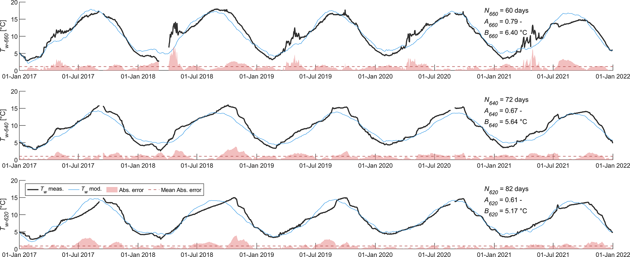 Figure 5Measured (Tw meas.) and modelled (Tw mod.) lake temperatures at various depths, along with the absolute error and mean absolute error between the two series. The tunnel intake level is 2.5 m below Tw−64 (middle graph), while the dotation intake level corresponds to Tw−620 (bottom graph). Nd, Ad, and Bd are the parameters of the statistical relationship for each depth d (Eq. 3).