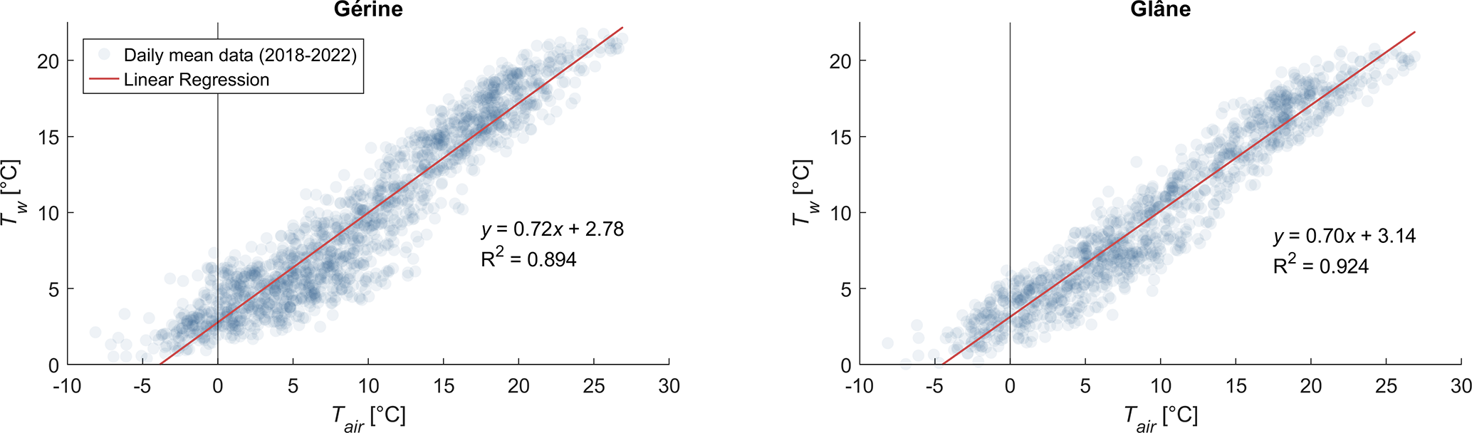 The daily mean temperature of the tributaries shows a strong correlation with the daily mean air temperature (Fig. 6: R2=0.89 for the Gérine and 0.92 for the Glâne over the period 2017–2022). Using the previously calculated delta change factors for air temperature, these could be applied to the historical temperature series of the tributaries by scaling them with the correlation coefficients between air and water temperature, which are 0.72 for the Gérine and 0.70 for the Glâne. This approach maintained the intrinsic variability of the historical series in the generated future projections.