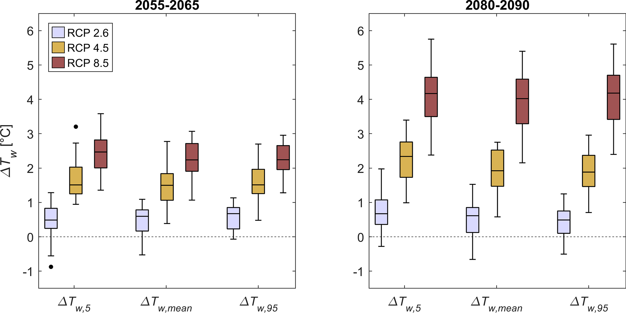 Mean temperature rises are predicted to remain below 1 °C for RCP 2.6 and exceed 4 °C for RCP 8.5 (Fig. 8). Thus, the identified increase in future mean annual stream temperature depends strongly on the emission scenario, especially toward the end of the century. The magnitude of this rise under RCP 8.5 aligns with values reported in recent studies (Michel et al., 2022; Fuso et al., 2023). On an annual scale and across the whole study reach, the magnitude of temperature variations remains similar whether minimal, average, or maximal temperatures are considered. This observation holds for the case where results are presented annually and averaged over all investigated sections.