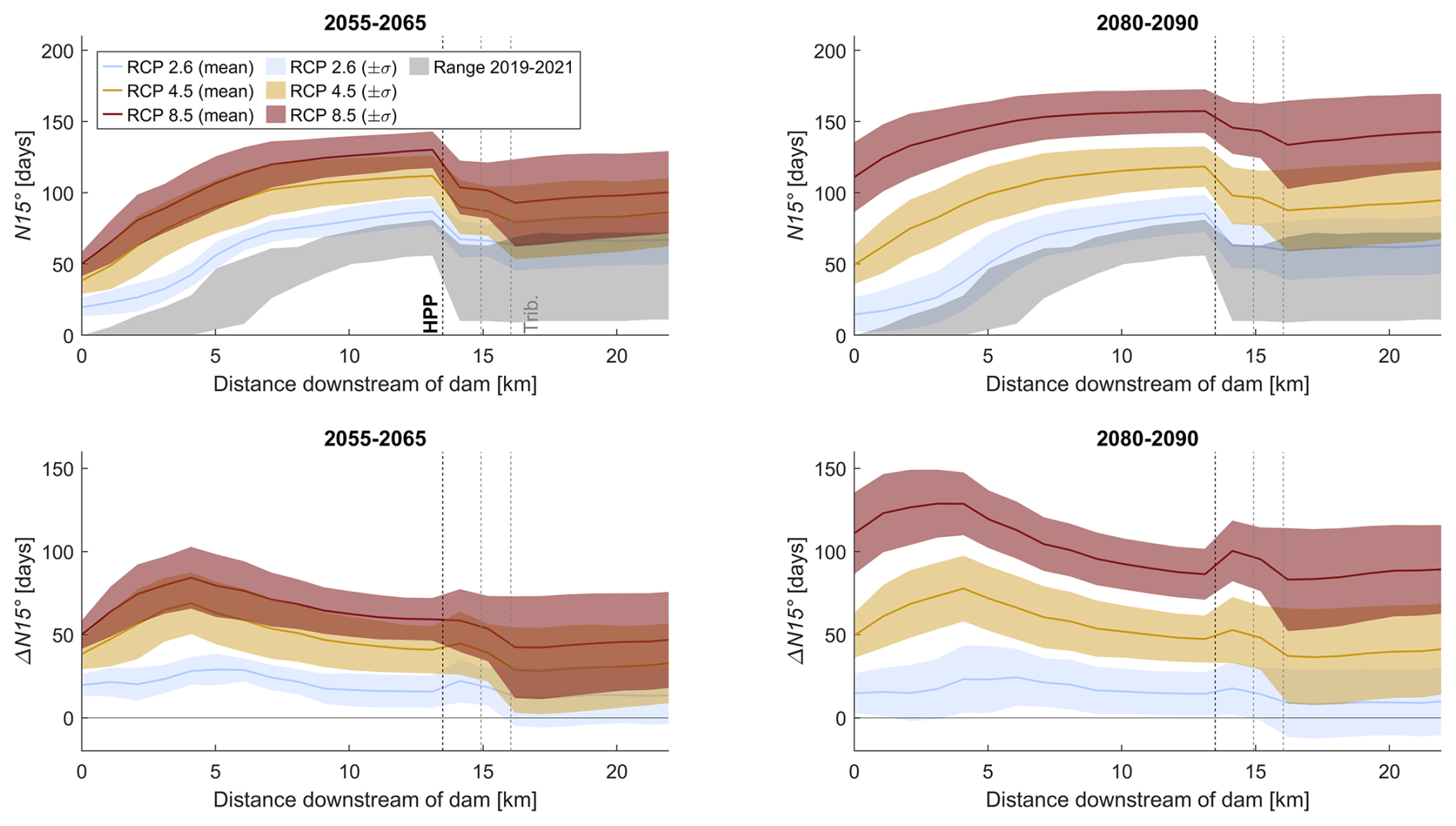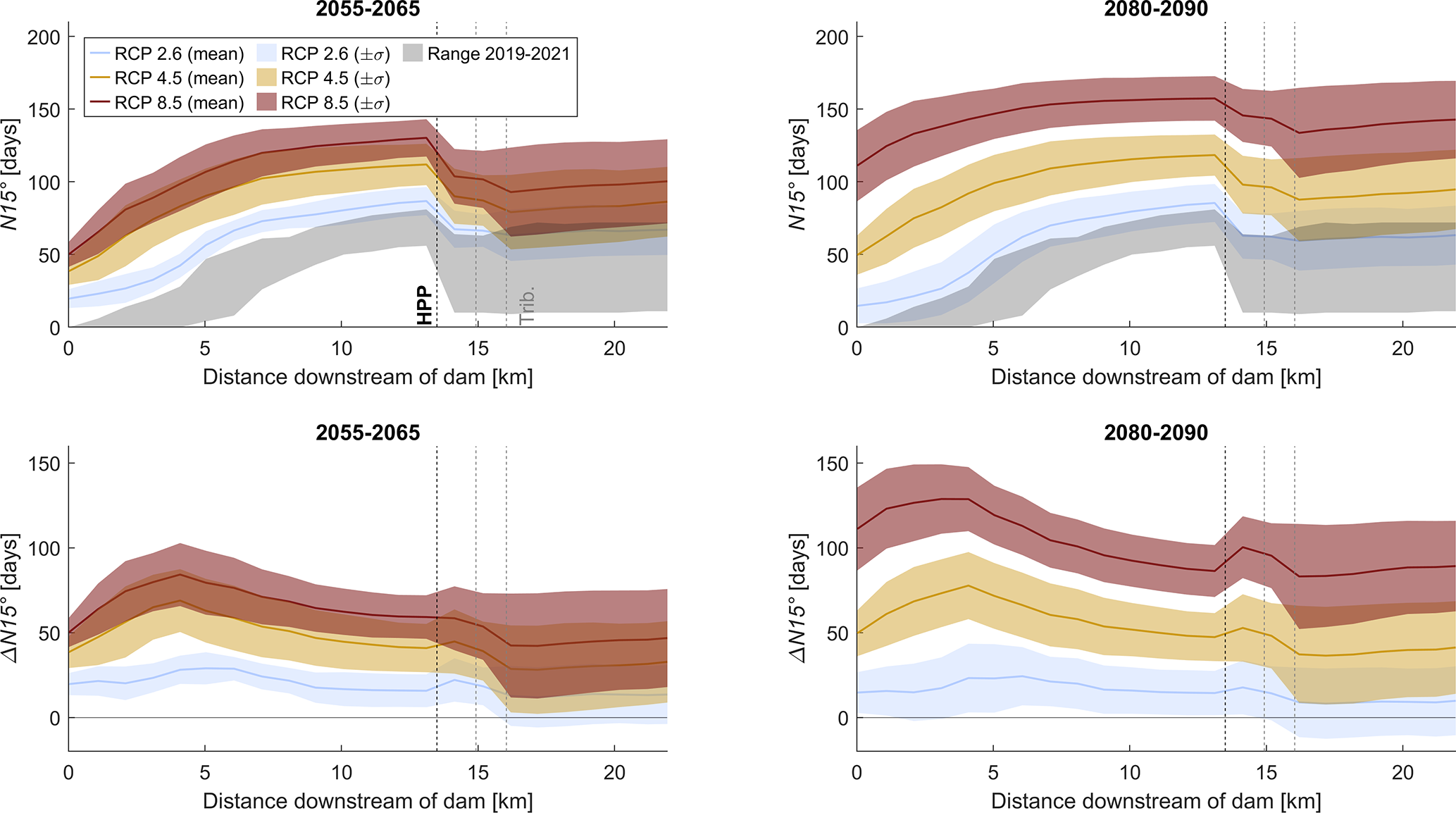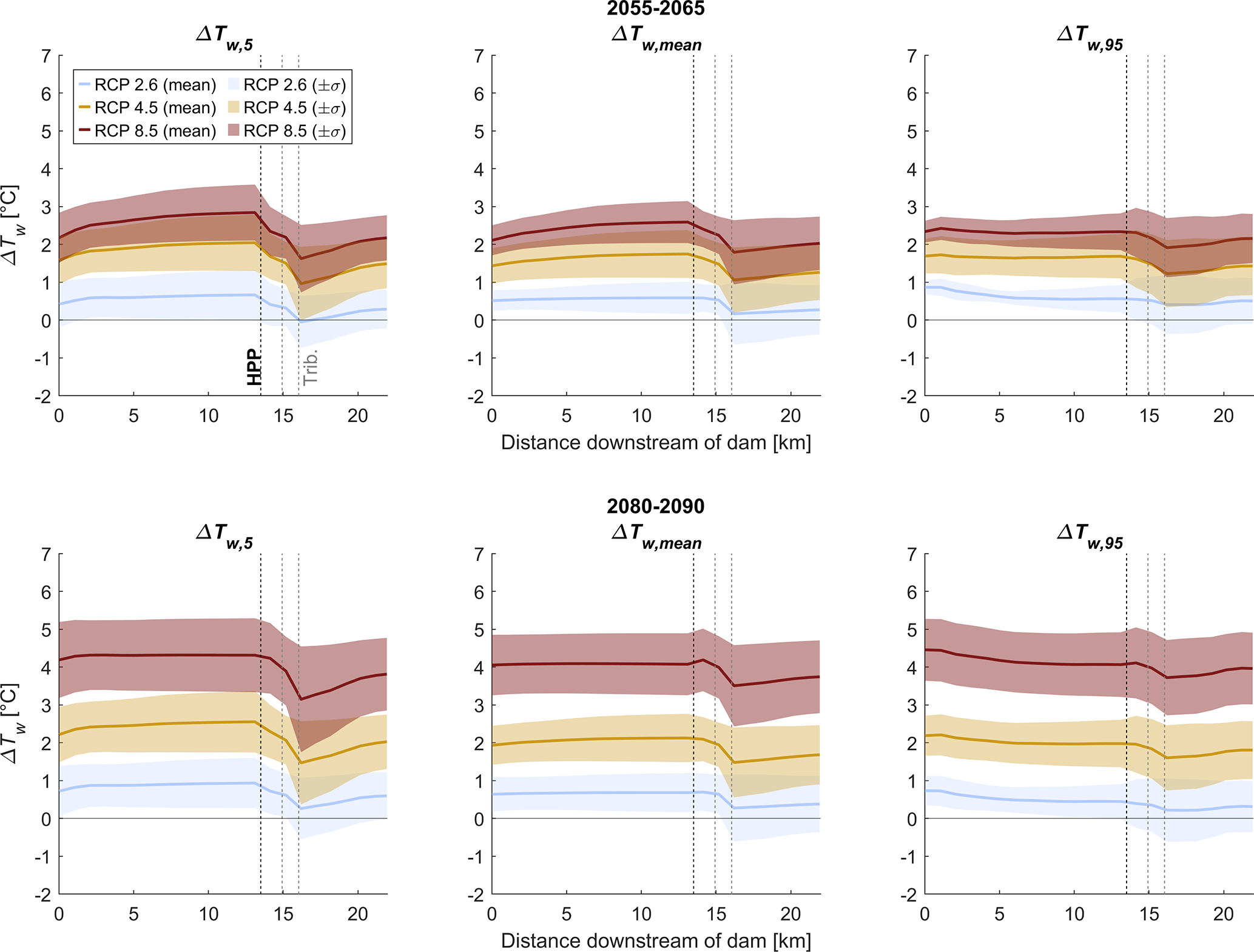 Temperature differences were further analyzed in terms of their spatial evolution along the investigated river reach. Figures 9 and 10 show respectively the temperature indicator (Tw,5, Tw,mean, Tw,95) and the temperature differences (ΔTw,5, ΔTw,mean, ΔTw,95) between future climate scenarios and current conditions along the river downstream from the Rossens Dam. The locations of the HPP outflow and the two main tributaries (Trib.) are marked with dashed lines. For each RCP, the range of the different results obtained from the simulations are represented by the mean value (solid bold line) along with a shaded area indicating the range between the lower and upper standard deviation. Overall, temperature increases vary with time-horizons and RCPs, showing more pronounced rises along the residual flow reach. Discontinuities in this trend are observed at the hydropower outflow and tributary confluences. Downstream, where discharge and flow velocity are higher, the temperature increases are generally less marked.