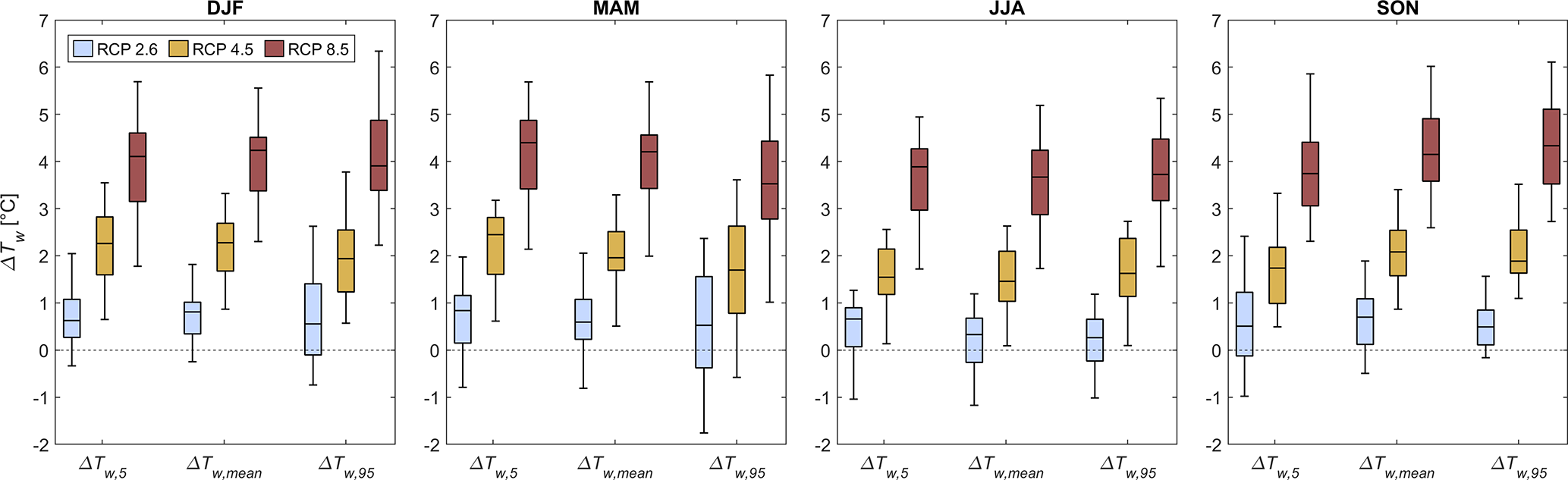 To describe the annual temperature distribution, the mean annual water temperature (Tw,mean) was calculated and high and low temperatures, excluding extremes, were expressed by the 5th and 95th percentiles of annual temperatures (Tw,5 and Tw,95, respectively).