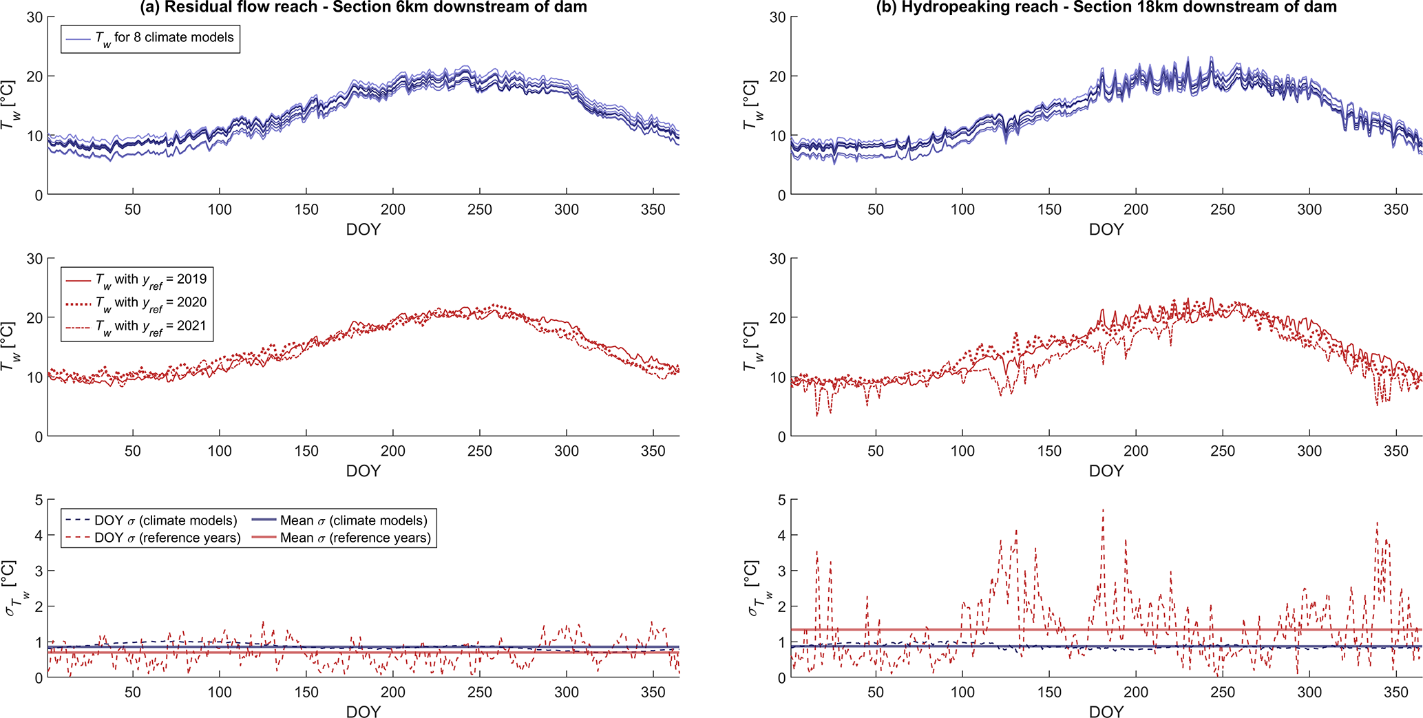 The results show high variability. Each box of Fig. 8 is a synthetic representation of 24 values, derived from the 24 simulations corresponding to the combination of 8 climate models and 3 reference years. An example of the diverse outcomes from these simulations is illustrated in Fig. 13, which presents annual time series of simulated water temperatures for two sections: one located halfway through the residual flow reach (panel a, 6 km downstream of the dam) and another downstream of both the HPP and the confluence with tributaries (panel b, 18 km downstream of the dam). The top row displays simulated temperatures for eight different climate models, all based on the same reference year (2019). The middle row presents results for three different reference years while using the same climate model (CM = 2). The bottom row shows the standard deviation across the series from the first two rows, with daily values (DOY) and the annual mean.