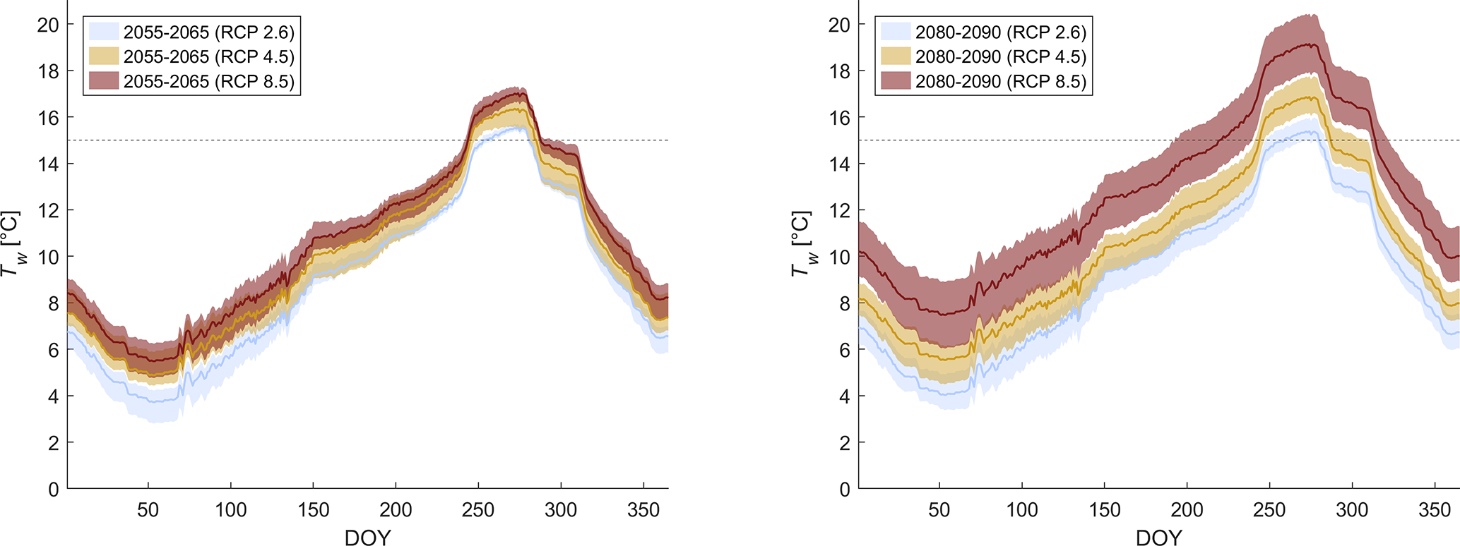 The results are first presented as average values over the entire study reach, providing an overall picture of the thermal response to climate change. The model predicts globally increasing stream temperatures under climate change. The extent of these increases depends obviously on the RCP, especially for the longer 2080–2090 horizon (Fig. 7). Stream temperatures are expected to increase the most under RCP 4.5 and RCP 8.5 by the end of the century in comparison with 2055–2065. For each RCP and time-horizon, temperature increases are relatively similar for the mean temperature (Tw,mean) as well as for low and high percentiles (Tw,5 and Tw,95) (Fig. 8). The full temperature spectrum responds in a similar way to climate change. Temperature differences for RCP 2.6 are similar between the two time-horizons, with a modest increase between 0 and 1 °C for all three indicators. For the other two RCPs, the temperature rise is more pronounced by the end of the century, especially for RCP 8.5, where average values are expected to increase by approximately +4 °C. The variability among results is highest for RCP 8.5 at the end of the century, with a range greater than 3 °C between minimum and maximum projections. Beyond these averages, indicators with direct ecological relevance provide additional insight. For example, across scenarios, projected warming manifests as a rising occurrence of days above the 15 °C threshold (see Appendix B).