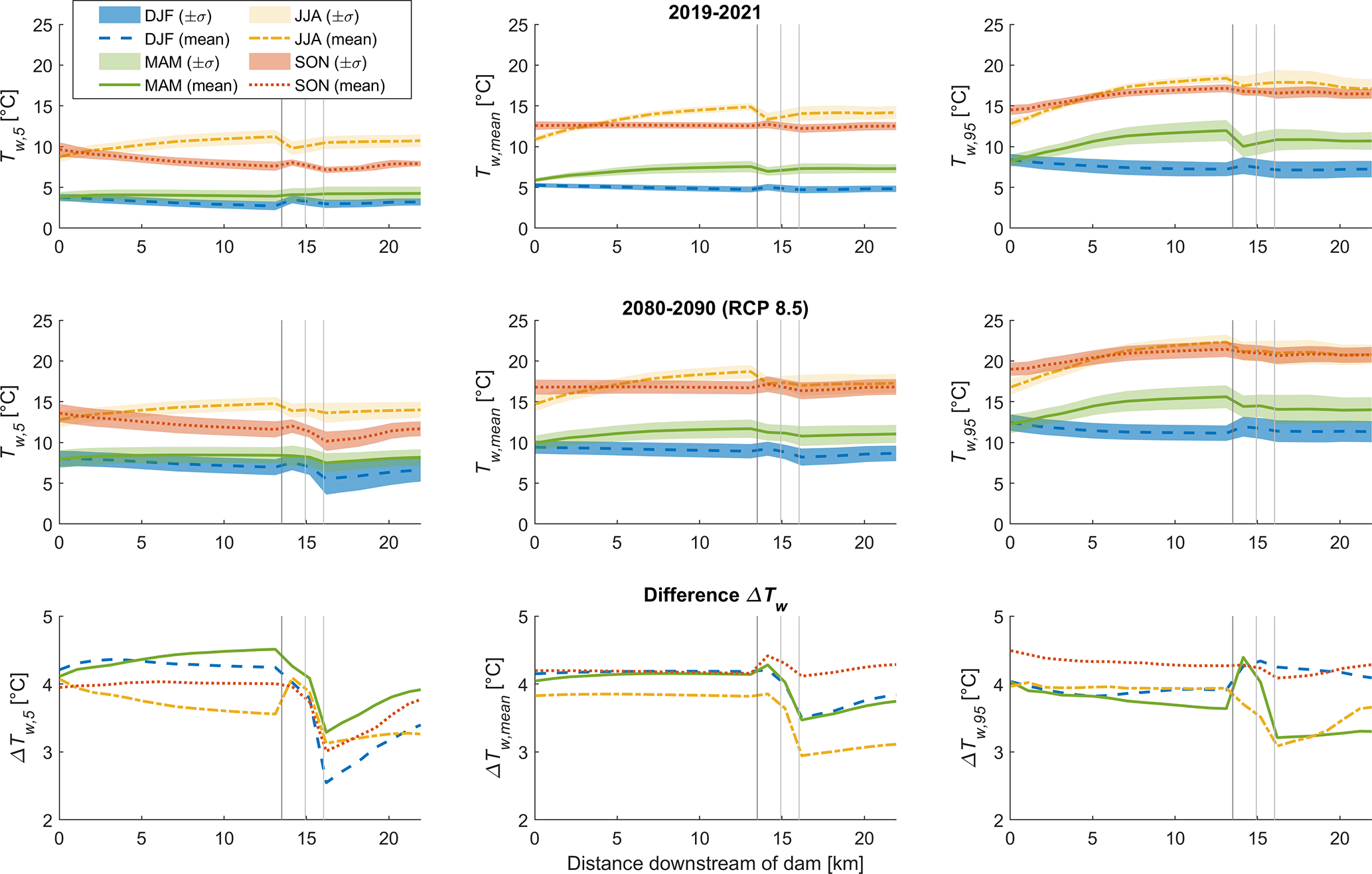 Figure C1Simulated seasonal temperature along the reach under current climate (top, 2019–2021) and future climate (middle, for 2080–2090 and RC P8.5) with the 5th percentile, the mean and the 95th percentile of the seasonal values, and difference between these simulated temperature indicators under future and current climate (bottom).