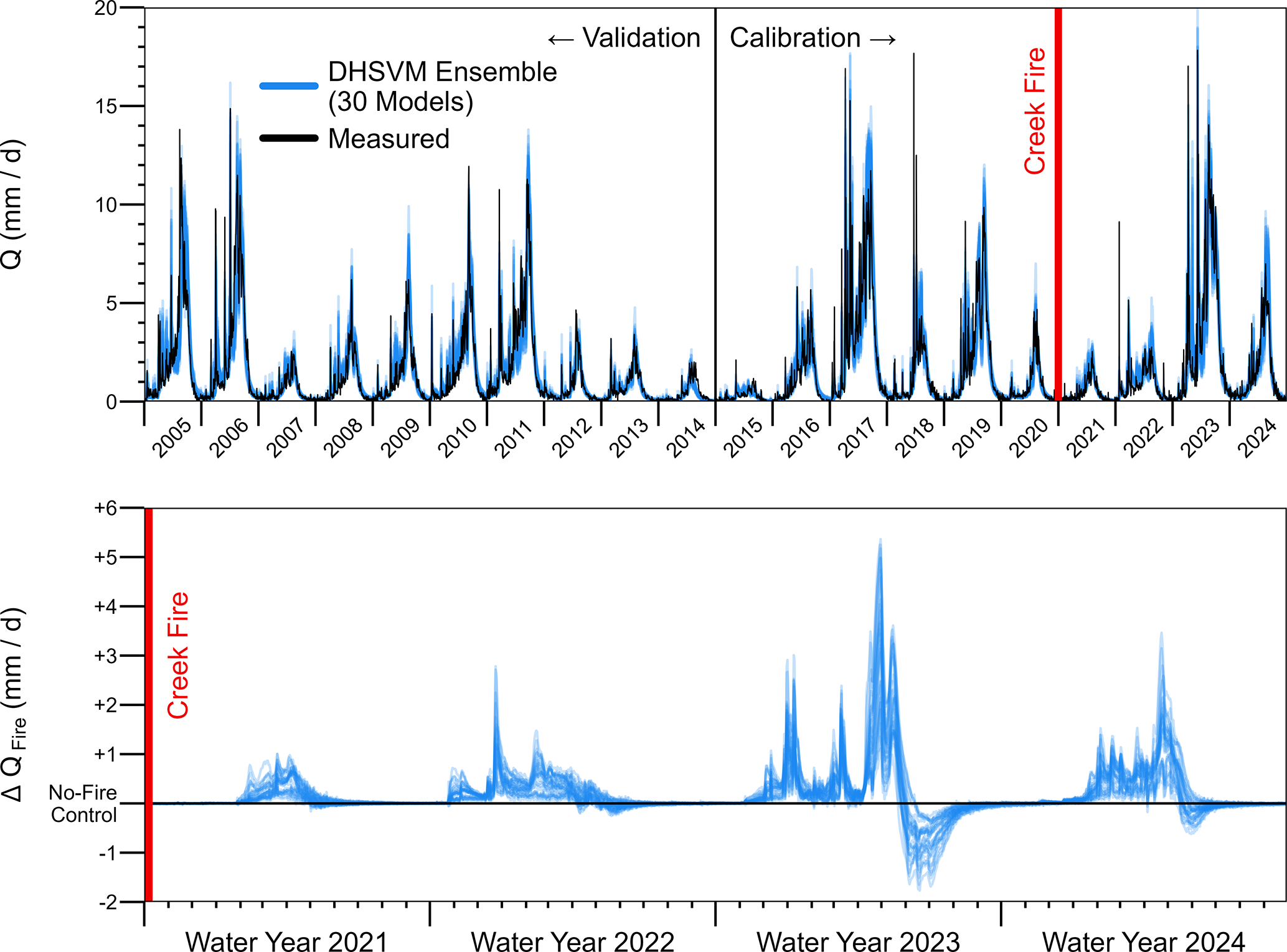 Figure 3Modeled and measured daily streamflow hydrographs (top panel) and streamflow differences between fire-aware and no-fire control simulations (bottom panel). Both panels show results from 30 calibrated “behavioral” parameter sets (Sect. 2.2).