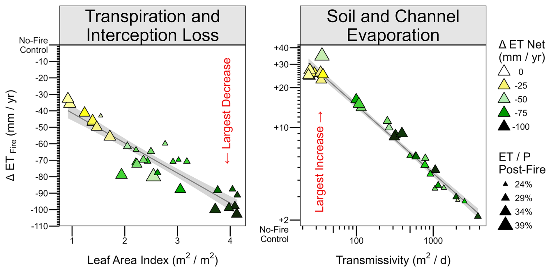 Figure 4Difference in ET fluxes between fire-aware and no-fire control simulations visualized relative to model parameter uncertainty. Each point represents a single behavioral parameter set (N=30) with all values spatially averaged within the watershed. The area-average leaf area index (LAI) is aggregated within the pre-fire forested area from maps of tree-scale LAI and grid-scale fractional cover (both of which are calibrated, see Table 1), and the area-average transmissivity is aggregated from maps of soil depth, conductivity, and exponential decrease using the DHSVM transmissivity equations (all three of which are also calibrated, see Table 1). Trend lines indicate the least-squares fit and 90 % confidence interval of the best-fit linear estimator.