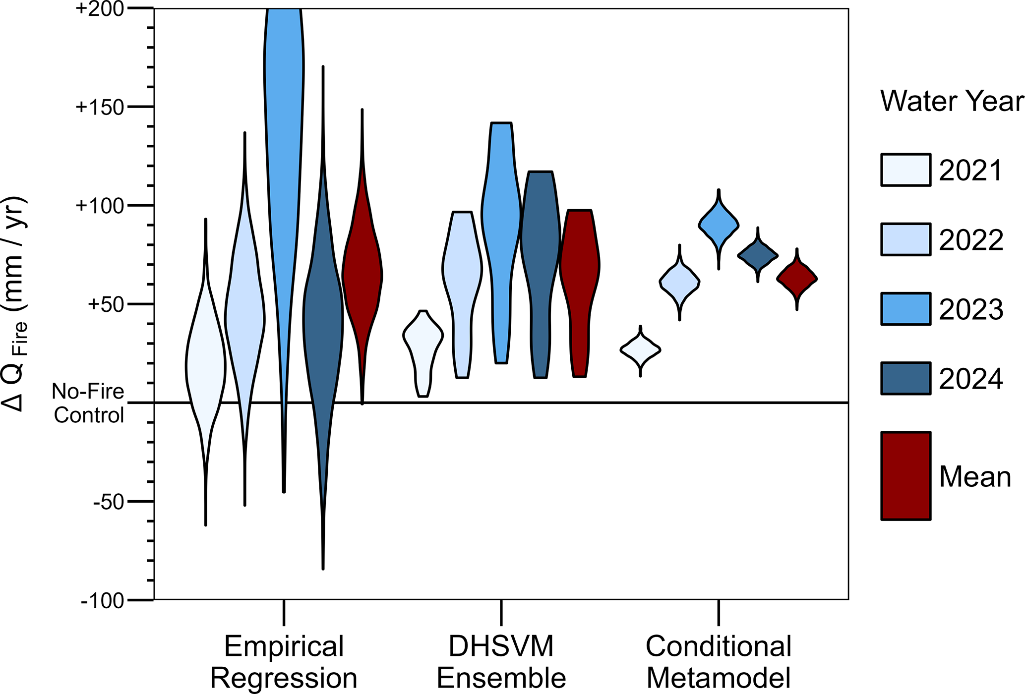 Figure 6Uncertainty distributions for the annual post-fire streamflow change relative to a control scenario with no fire. Empirical regression results are estimated by comparing post-fire measurements with 1000 random samples of a pre-fire multi-linear regression model (Eq. 3). The DHSVM ensemble represents the difference between fire-aware and no-fire control simulations using 30 different calibrated parameter sets. The conditional metamodel predicts the DHSVM response subject to the requirement of stationary bias using 1000 random samples of the Bayesian regression in Eq. (2). (Note that the vertical axis is truncated at +200 mm yr−1 for increased visibility of most results.)