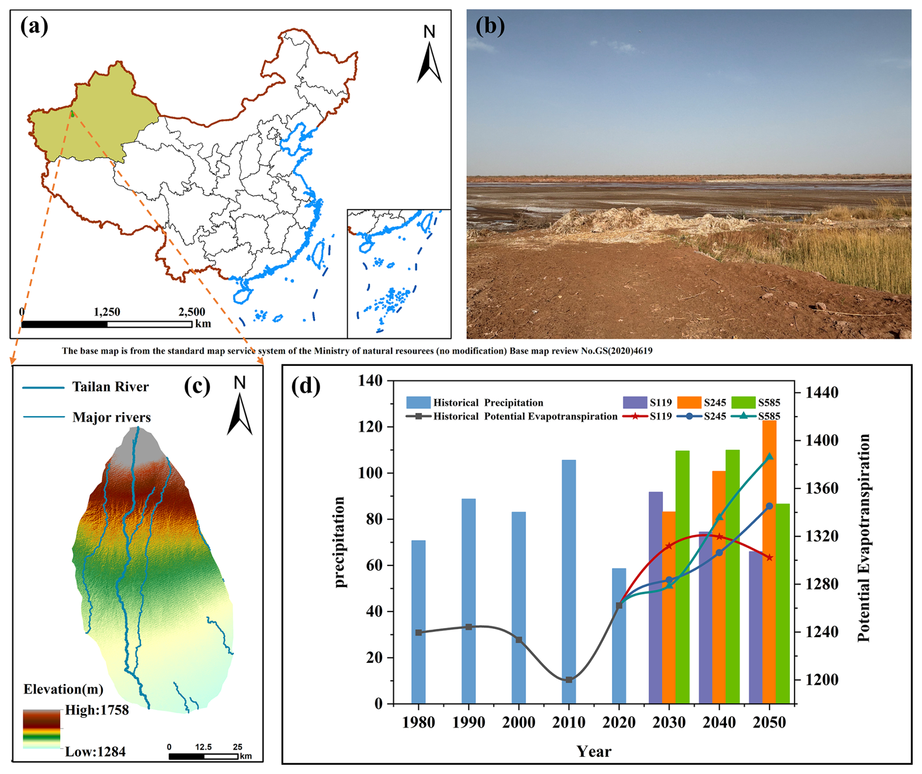 Figure 1Overview of the Tailan River Basin (TRB): (a) schematic map showing the location of TRB in China; (b) actual landscape of the Tailan River; (c) Digital Elevation Model (DEM) of TRB; (d) precipitation and potential evapotranspiration for historical and future periods in TRB (The base map is from the standard map service system of the Ministry of natural resources (no modification) Base map review No. GS (2020) 4619).