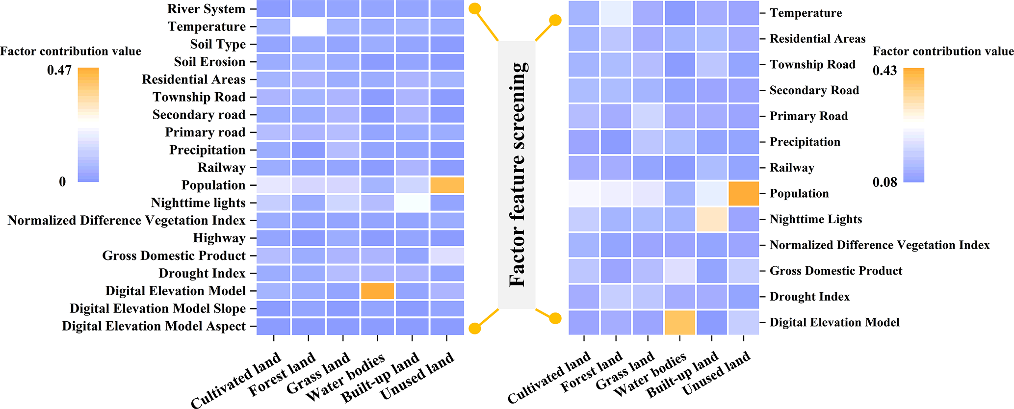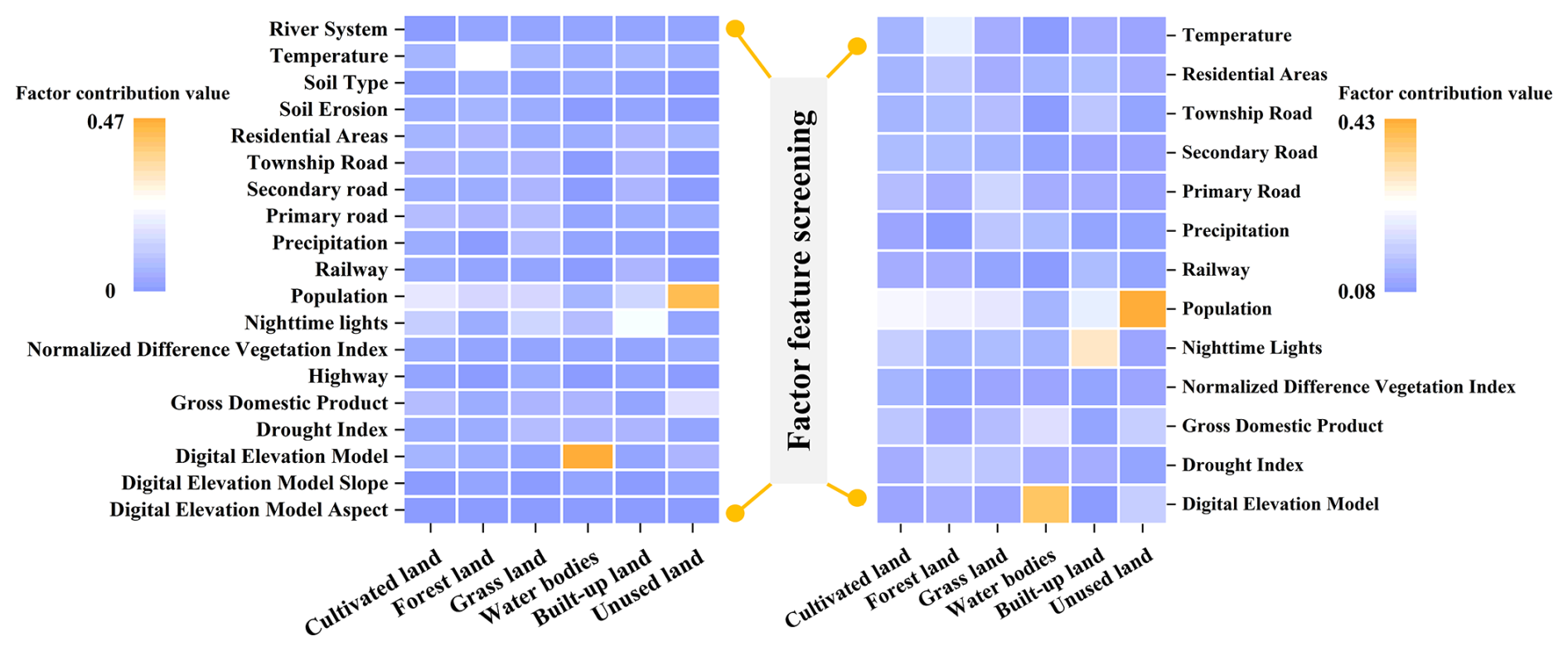 Different land types exhibit significantly varying degrees of responsiveness to driving factors due to differences in their spatial demand and evolutionary trajectories (Fig. 4). Specifically, population plays a core driving role in the evolution of multiple land types: it exhibits the highest contribution rates to cultivated land (0.22), forest land (0.19), grassland (0.17), built-up land (0.18), and unutilized land (0.43). Other key driving factors also show specific influences: the Nighttime Light Index has relatively high contributions to cultivated land (0.12) and built-up land (0.29), the Aridity Index to forest land (0.11) and grassland (0.09), and the Digital Elevation Model (DEM) also contributes significantly to water bodies (0.38).