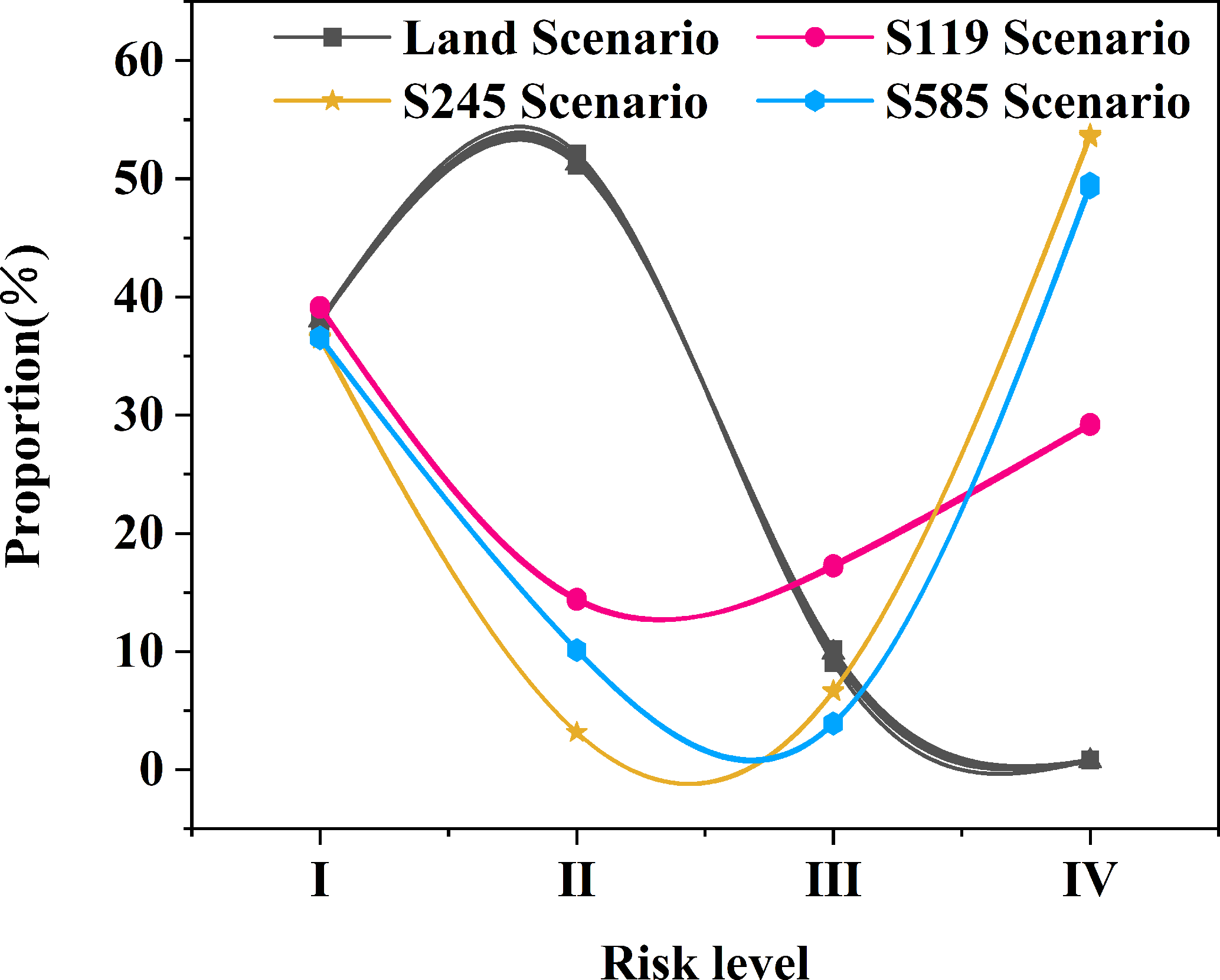 To assess water supply-demand risks in the TRB region, an evaluation framework was established using four indicators: water supply-demand ratio, trend of water supply-demand ratio, water supply trend, and water demand trend. Spatial patterns of water supply-demand risk in the TRB exhibit heterogeneity across scenarios (Fig. 7). Although risk classification levels vary under different climate scenarios, no grid cell in the TRB escapes hazardous (Level IV) risk (Table 2 indicates a 7-level classification system). This is closely linked to continuously increasing water demand in the TRB. Using NIS as the baseline, the scenario maintaining current rainfall and potential evapotranspiration (Land) shows the most severe water scarcity: Level II risk accounts for 51.31 %, while Level IV risk constitutes merely 0.85 %. Under the other three climate scenarios, water supply-demand risks are alleviated, with Level IV risk proportions being 29.24 % (S119), 53.60 % (S245), and 49.34 % (S585) respectively (Fig. 8). The S245-EPS scenario achieves maximum risk mitigation in the TRB, as its rainfall levels increase steadily per decade among the three climate scenarios (Fig. 1d), thereby alleviating regional water stress. While the TRB's harsh current climate exacerbates water risks, future climatic changes may moderately alleviate these risks compared to present conditions. In summary, by 2050 the entire TRB will face water supply-demand crises, with at least 46 % of the area subjected to endangered (Level III) risk, including no less than 10 % of land confronting critical endangered (Level II).